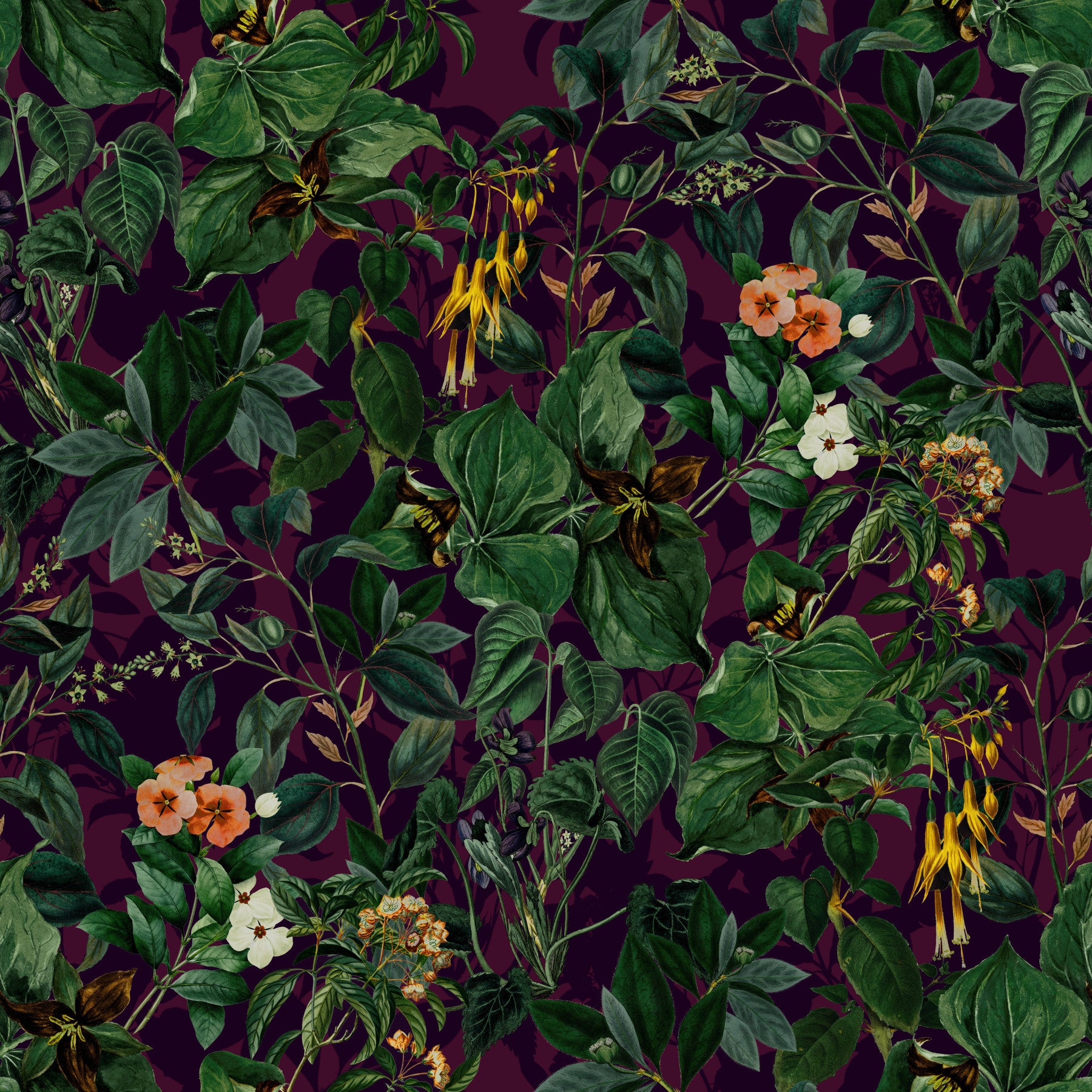 Transform your space with this lush, vintage-inspired wallpaper for walls. Observe an enchanting design with densely packed foliage and blooms in shades of emerald and golden yellow against a dark plum backdrop. This pattern evokes a sense of secret garden intrigue. It makes a statement in a hallway, entryway, or living room. The design complements interiors aiming for a sophisticated, timeless vibe and it brings depth and character.
