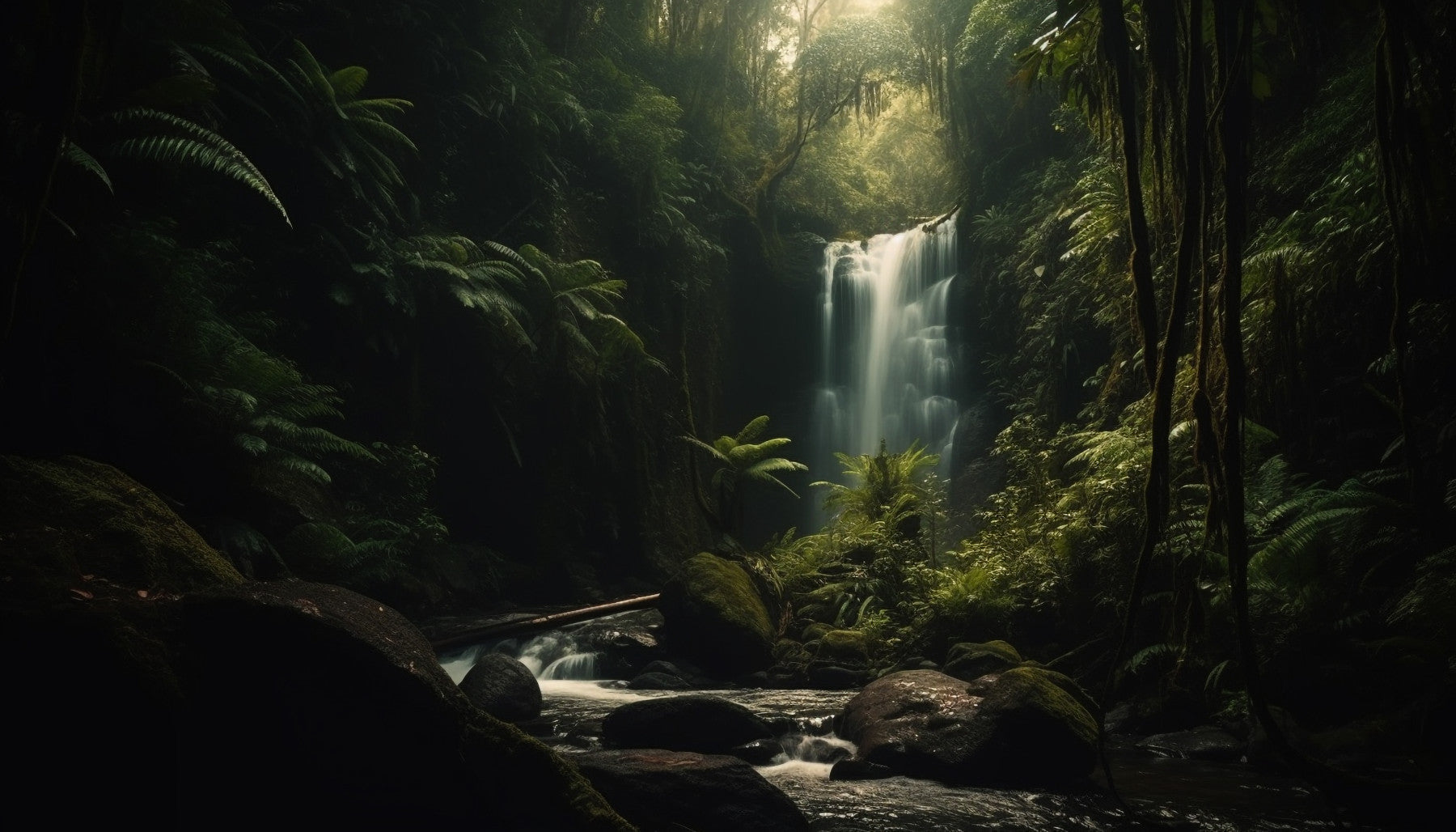 Venture into the heart of an untouched realm with 'Dark Forest with Waterfall'. This captivating wallpaper invites you to explore a dense, mysterious woodland, where the shadows dance amongst towering trees and lush ferns. The focal point is a majestic waterfall cascading down moss-covered rocks, creating a serene yet powerful atmosphere. The interplay of light and shadow adds depth and intrigue, highlighting the raw beauty and untamed nature of this hidden oasis. Perfect for those who seek solace in nature's embrace and wish to bring a touch of the wild into their digital world. Immerse yourself in the tranquil sounds and breathtaking scenery of this enchanting dark forest, a captivating escape that will transform your screen into a window to the wilderness.
