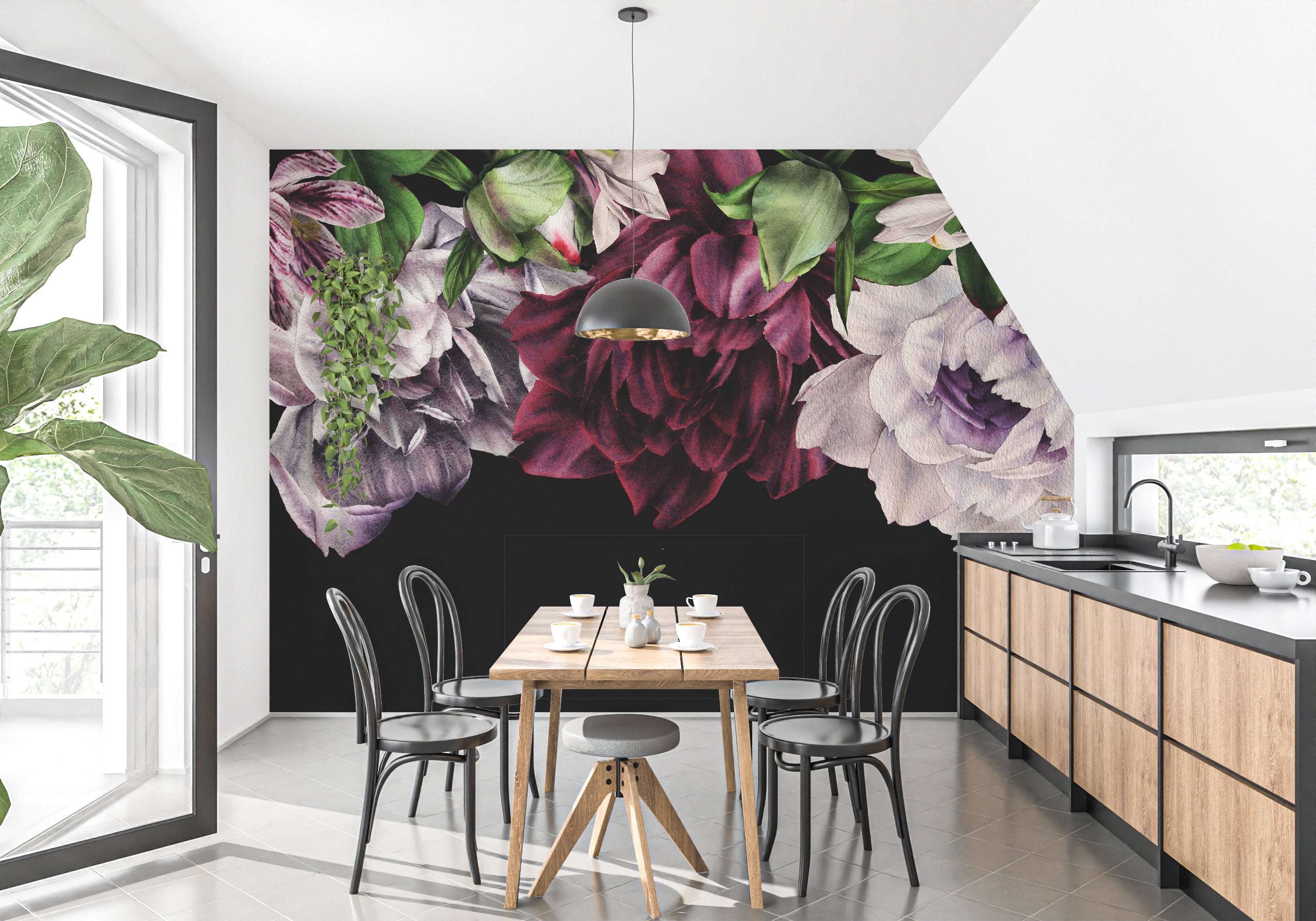 Immerse your living room in the romantic luxury of the dark peonies wedding flowers mural wallpaper. This design captures the lush beauty of peonies in full bloom, their petals rendered in deep shades of crimson and violet, set against an elegant black background that accentuates their rich tones. The watercolour texture brings a delicate, hand-painted feel to each flower, adding a layer of sophistication and depth. Ideal for creating a focal point, this flower wallpaper celebrates the timeless allure of nature's artistry, lending a dramatic yet inviting atmosphere to any living room setting. It's a celebration of botanical beauty that promises to be the centrepiece of your home decor.