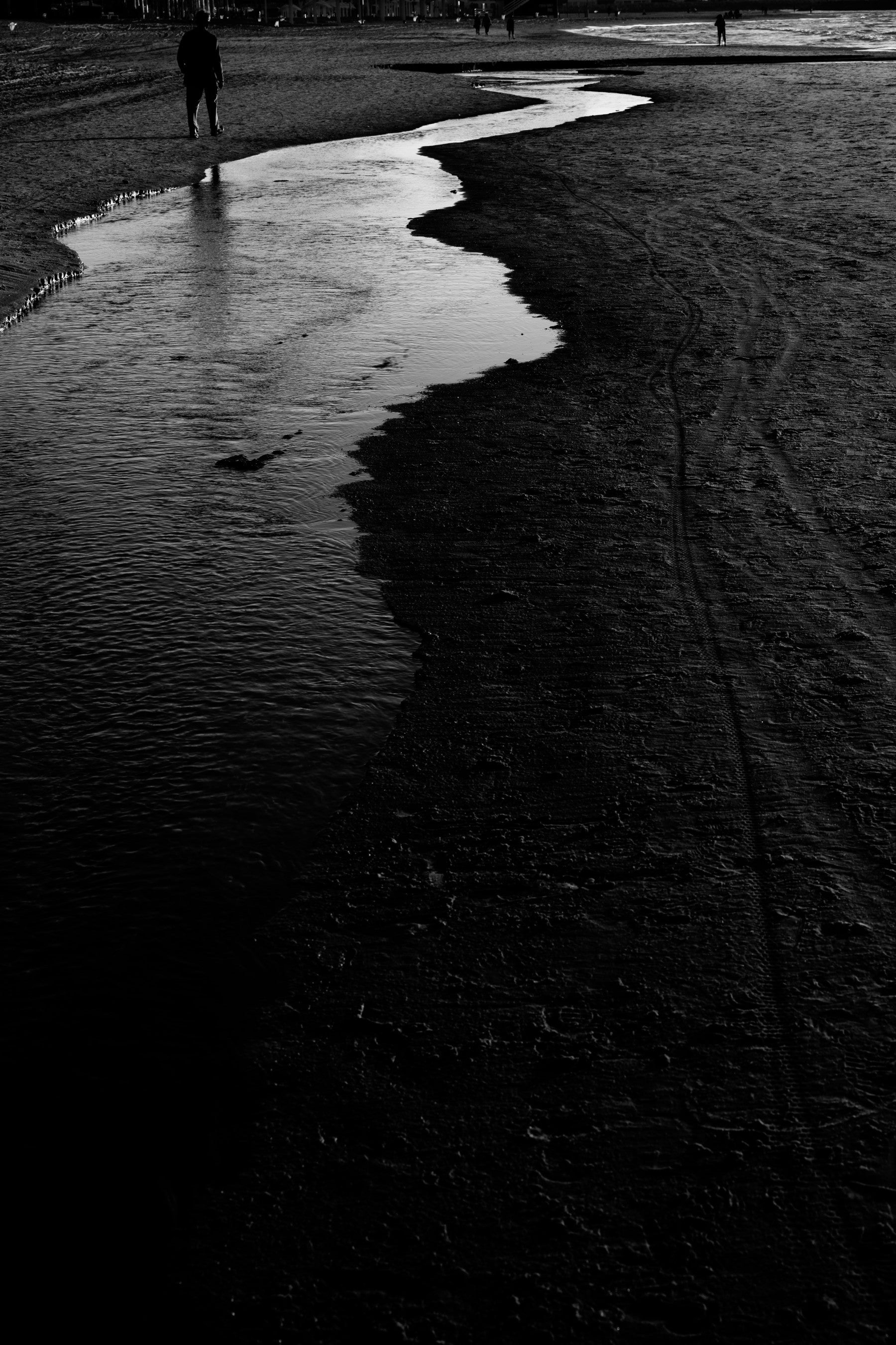 Drift into the depths of 'Dark River V,' a monochrome landscape that captures the stark beauty of nature's duality. A sinuous river, reflecting the diffused light of an unseen sky, cuts a path through the coarse, dark earth. The monochrome palette enhances the contrast, emphasizing the raw texture of the ground and the fluid grace of the water. Footprints and tire tracks whisper tales of fleeting presence, leaving a haunting echo in the serene expanse. A lone figure on the shoreline adds to the sense of solitude and contemplation. Transform your digital space with this evocative piece, inviting a sense of calm introspection and the stark beauty of the natural world into your everyday life.