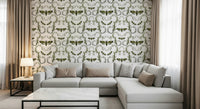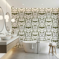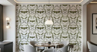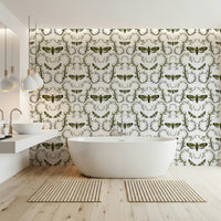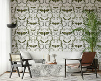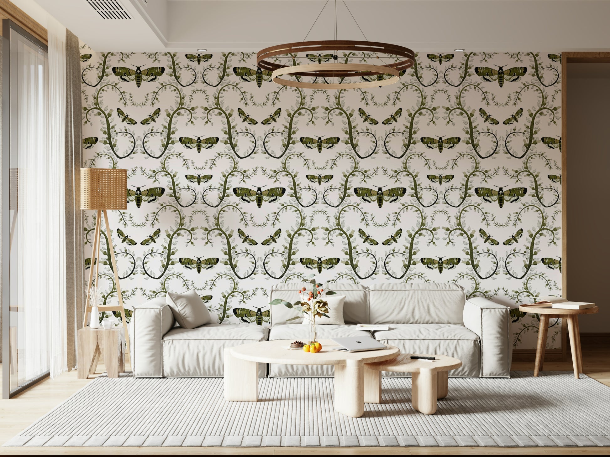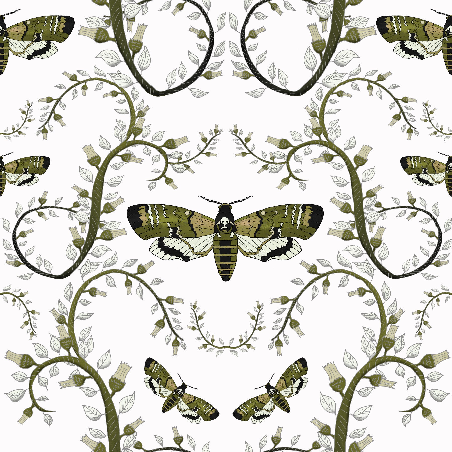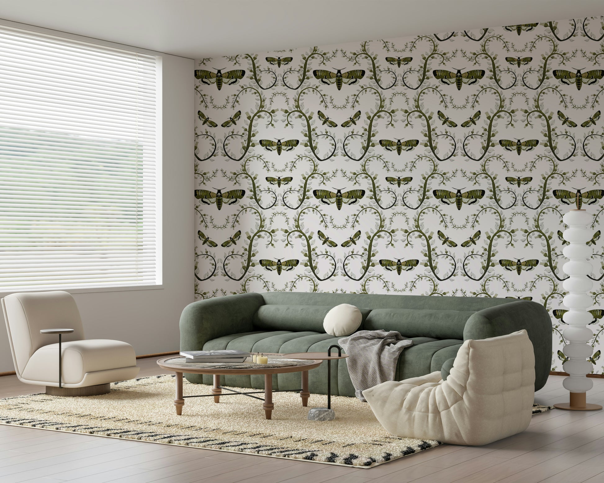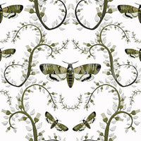 This wallpaper features a captivating design of Death's-Head Hawkmoths elegantly intertwined with stylised botanical elements. The moths, rendered in a rich olive green and black, contrast beautifully against the soft, silvery-grey leaves and beige flower buds. The intricate, swirling vines create a sense of movement and elegance, while the moths themselves add a touch of mystery and intrigue. The overall effect is a sophisticated and slightly gothic aesthetic, perfect for adding a unique touch to any room.