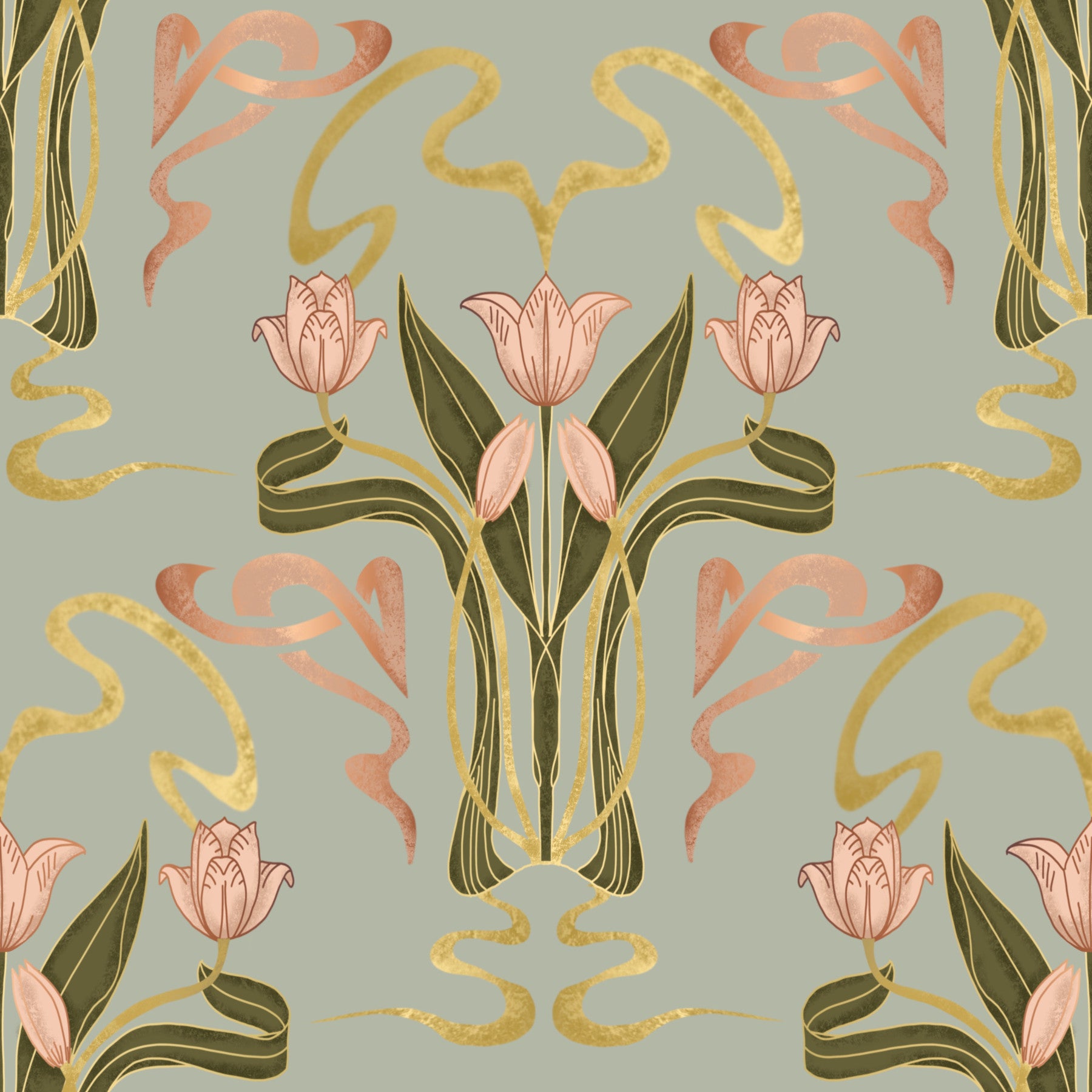 Indulge in the elegant charm of "Deco Tulip Bloom," a wallpaper design that seamlessly blends Art Deco geometry with Art Nouveau floral motifs. Subtle blush pink tulips, rendered with exquisite detail, take center stage against a calming muted sage grey backdrop. Intricate golden and rose gold Art Deco ribbons and stylized foliage create a luxurious and sophisticated pattern, perfect for adding a touch of vintage glamour to any space. The muted color palette ensures a serene and timeless ambiance, making this wallpaper a versatile choice for bedrooms, living rooms, or even home offices seeking a sophisticated aesthetic.