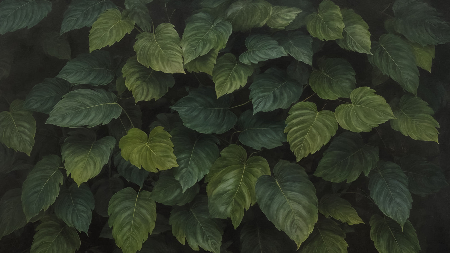 A wall mural depicting a dense wall of various types of green leaves.