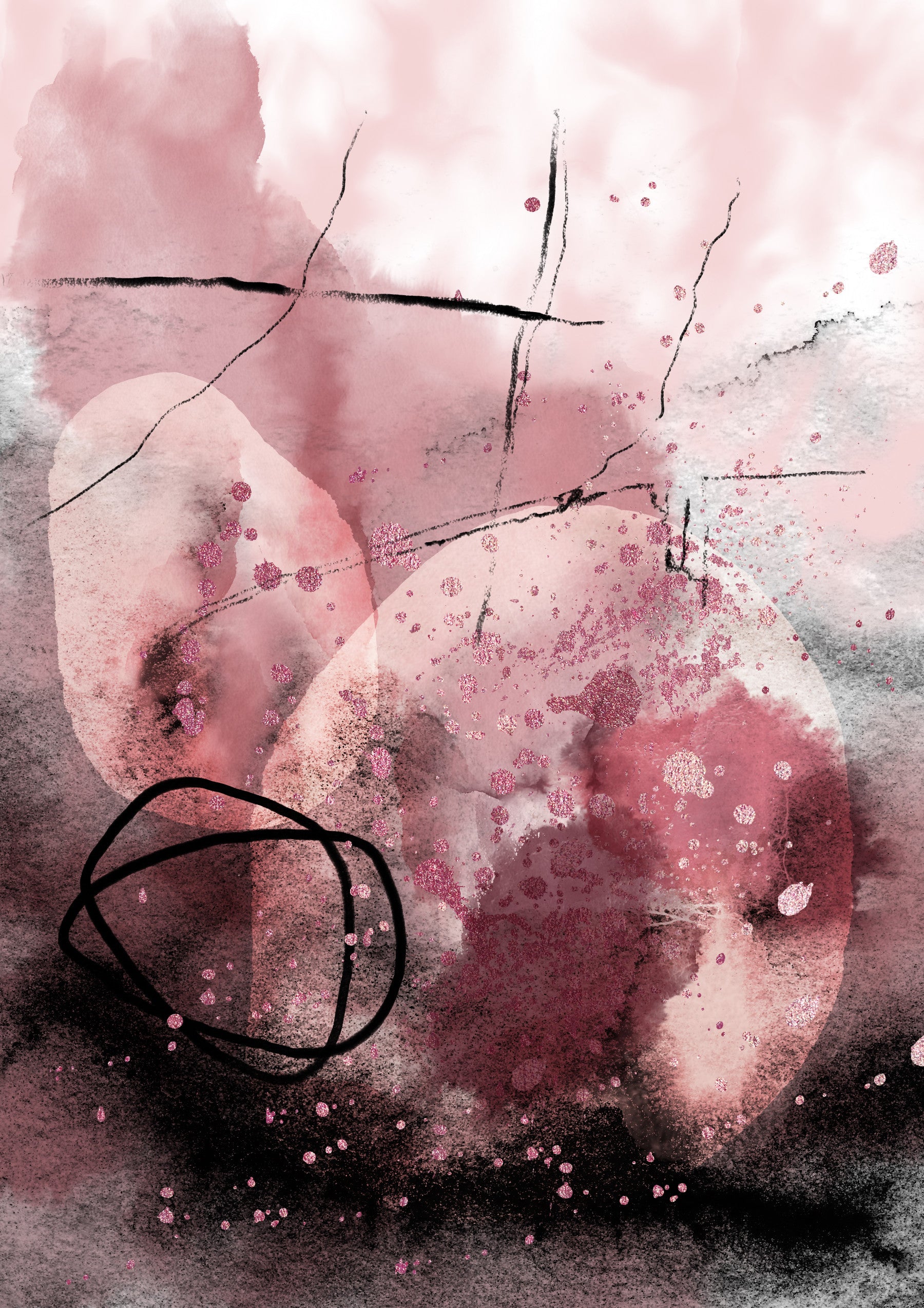 This wallpaper is a captivating blend of abstract watercolour art and minimalist design. Soft rose, blush pink, and dusky mauve hues dance across a canvas of charcoal and black, creating a dreamy and sophisticated atmosphere. Delicate rose gold glitter accents add a touch of luxury, while the organic shapes and flowing lines evoke a sense of tranquility and calm. Perfect for bedrooms, living rooms, or any space needing a touch of serene elegance. The interplay of light and dark, along with the subtle sparkle, adds depth and visual interest, making it a truly unique piece of art for your walls.