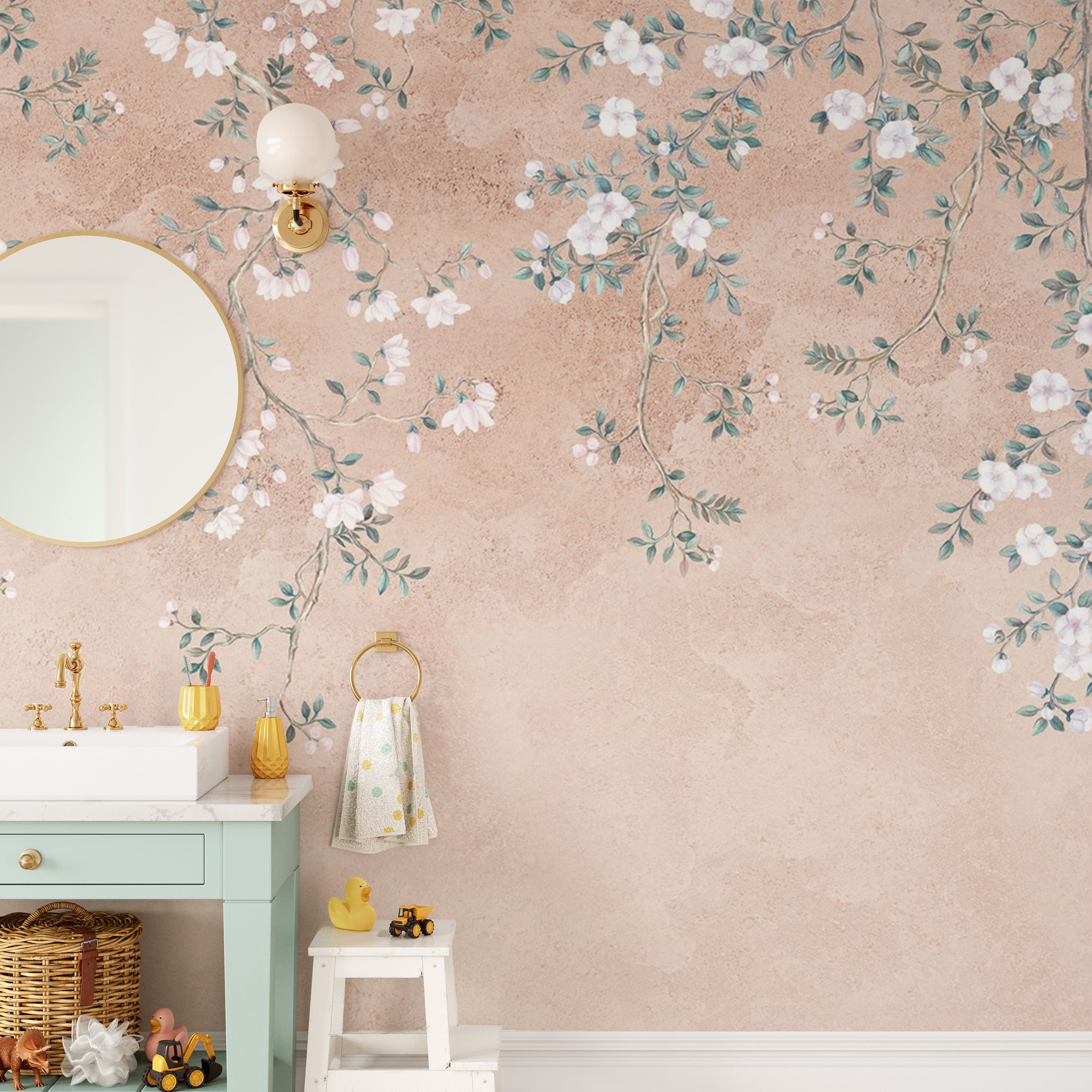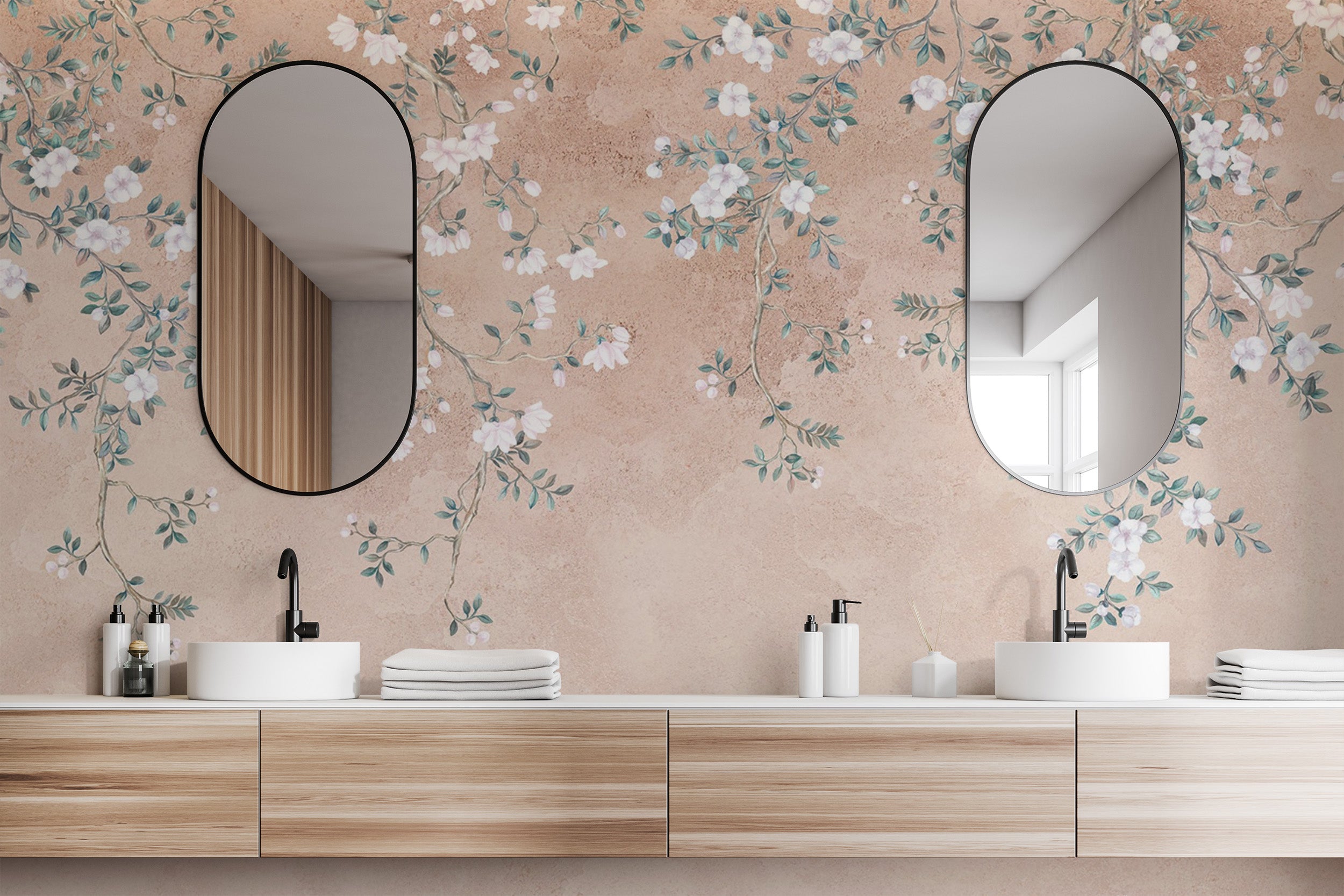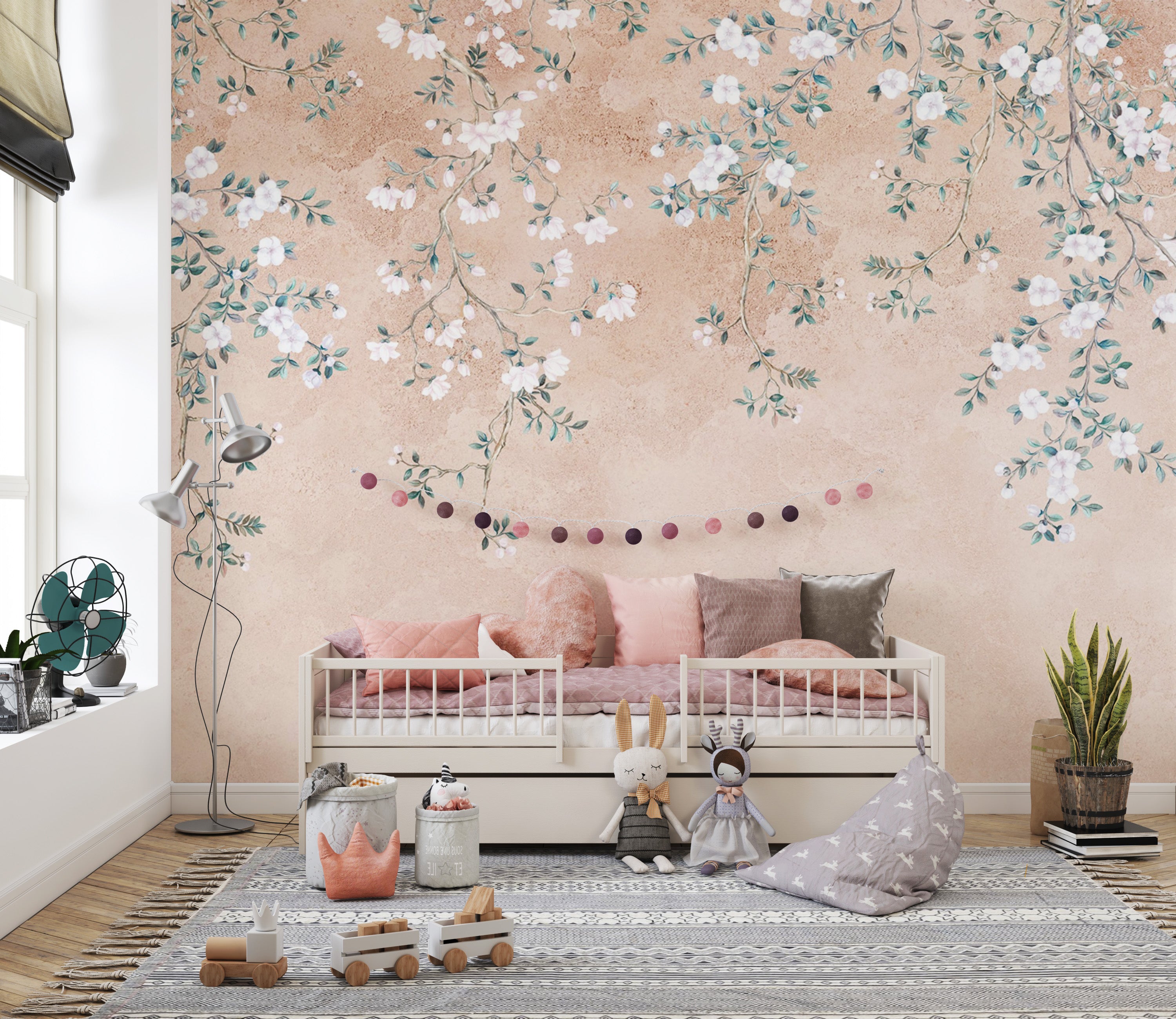 The delicate floral branch wallpaper mural brings your walls a soft, timeless beauty. This floral wallpaper mural features hand-painted branches with delicate white blossoms, adding a gentle, nature-inspired touch to any room. The subtle beige background complements the fine details of the delicate flower branch wallpaper, making it perfect for bedrooms, living rooms, or hallways. Its muted tones and elegant design fit effortlessly with classic and modern interiors. The beige floral wall covering enhances the room's natural light while offering a calming visual experience. Create a refined, botanical look with this nature-inspired floral wallpaper.