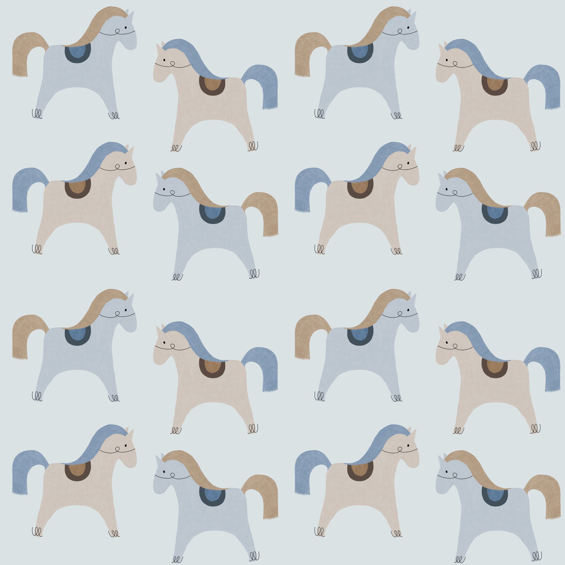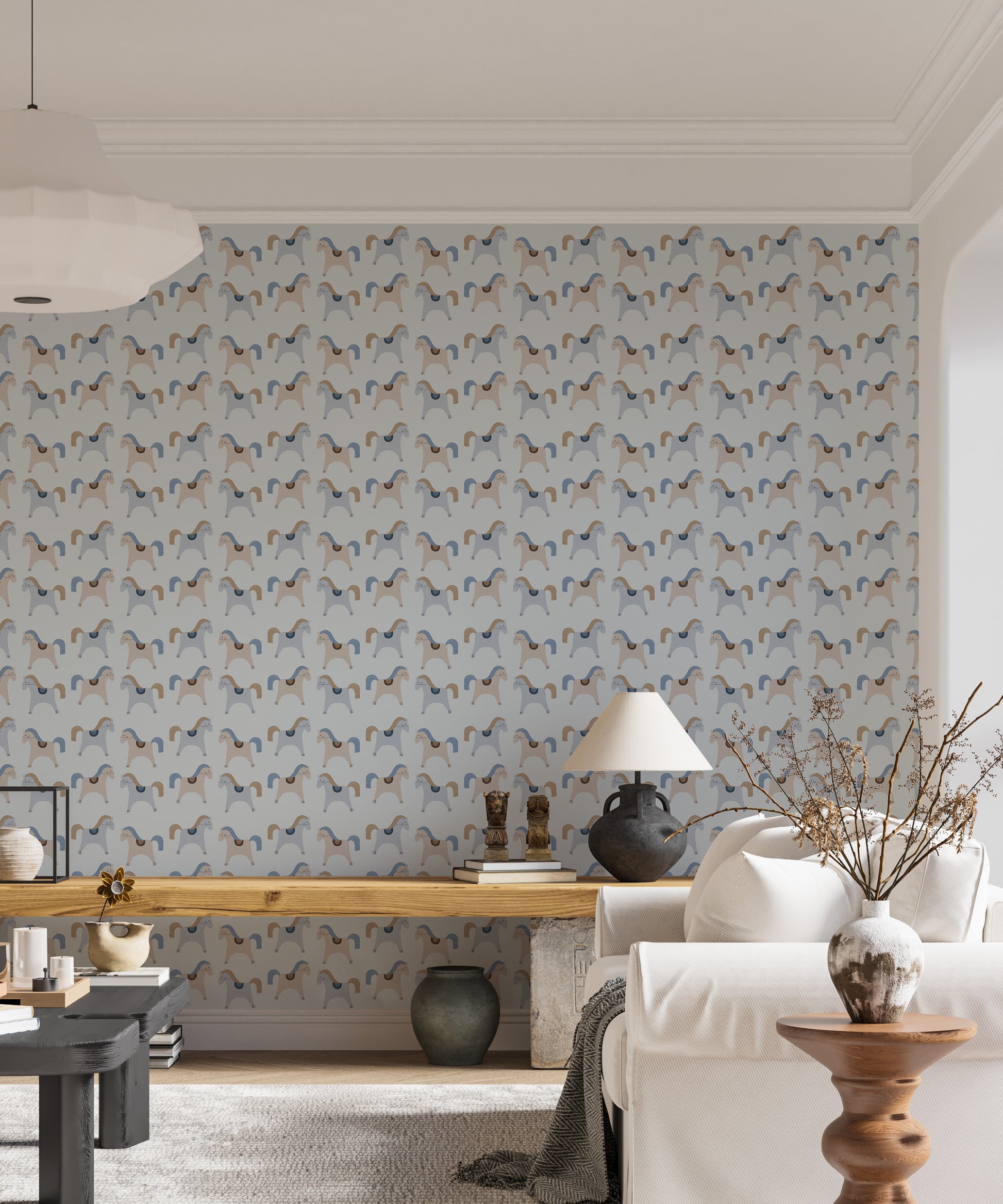 Bring whimsy to any room with the Delight Carousel wallpaper, featuring a playful pattern of cheerfully illustrated horses. This charming design invites a sense of nostalgia and joy, perfect for a child's room, creative space, or any area needing a touch of merriment.