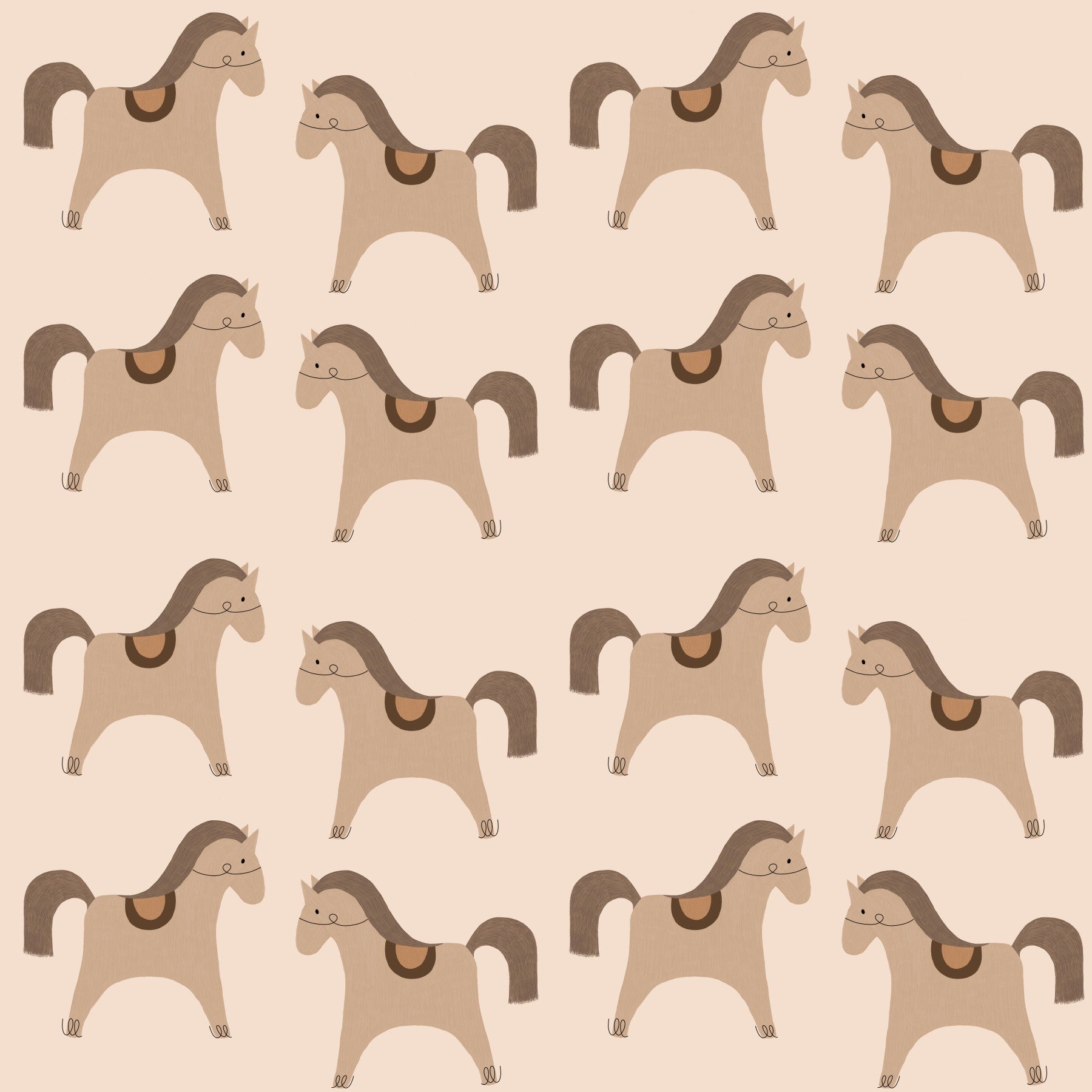 Embrace the whimsical charm of 'Delight Carousel 05,' a delightful wallpaper featuring a repeating pattern of stylized, friendly horses. Rendered in soft, earthy tones of beige and brown, these charming steeds exude a gentle and playful energy. Their simplistic design, complete with fluffy manes and tails, creates a calming and subtly nostalgic atmosphere, perfect for adding a touch of understated elegance and childlike wonder to any digital device. The repeating pattern provides a soothing visual rhythm, making it ideal for those seeking a peaceful and aesthetically pleasing background.