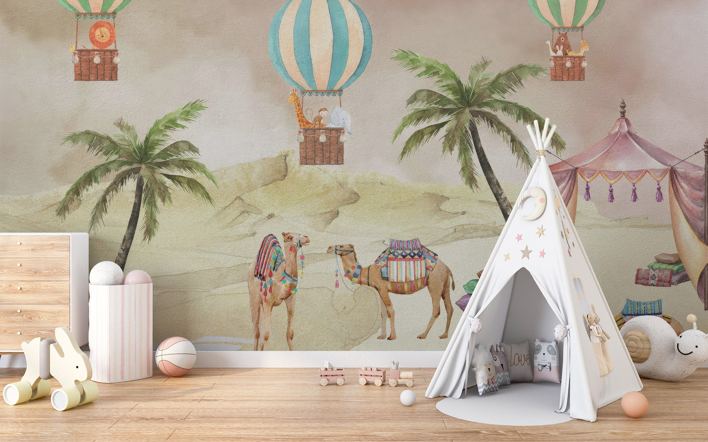 Embark on an enchanting journey across sandy dunes and palm trees with our desert adventure kids wallpaper. Featuring colorful hot air balloons floating serenely above camels and a vibrant desert oasis, this wallpaper will capture your child's imagination. The detailed illustration brings a playful yet serene vibe to any room, making it perfect for young adventurers. Install this captivating hot air ballon-themed wallpaper to spark your child's sense of wonder and curiosity. The playful design encourages storytelling and imaginative play, creating an engaging environment. Shop now to turn your kid’s room into a dreamy desert adventure land. Let the desert's magic inspire your child's dreams and adventures.