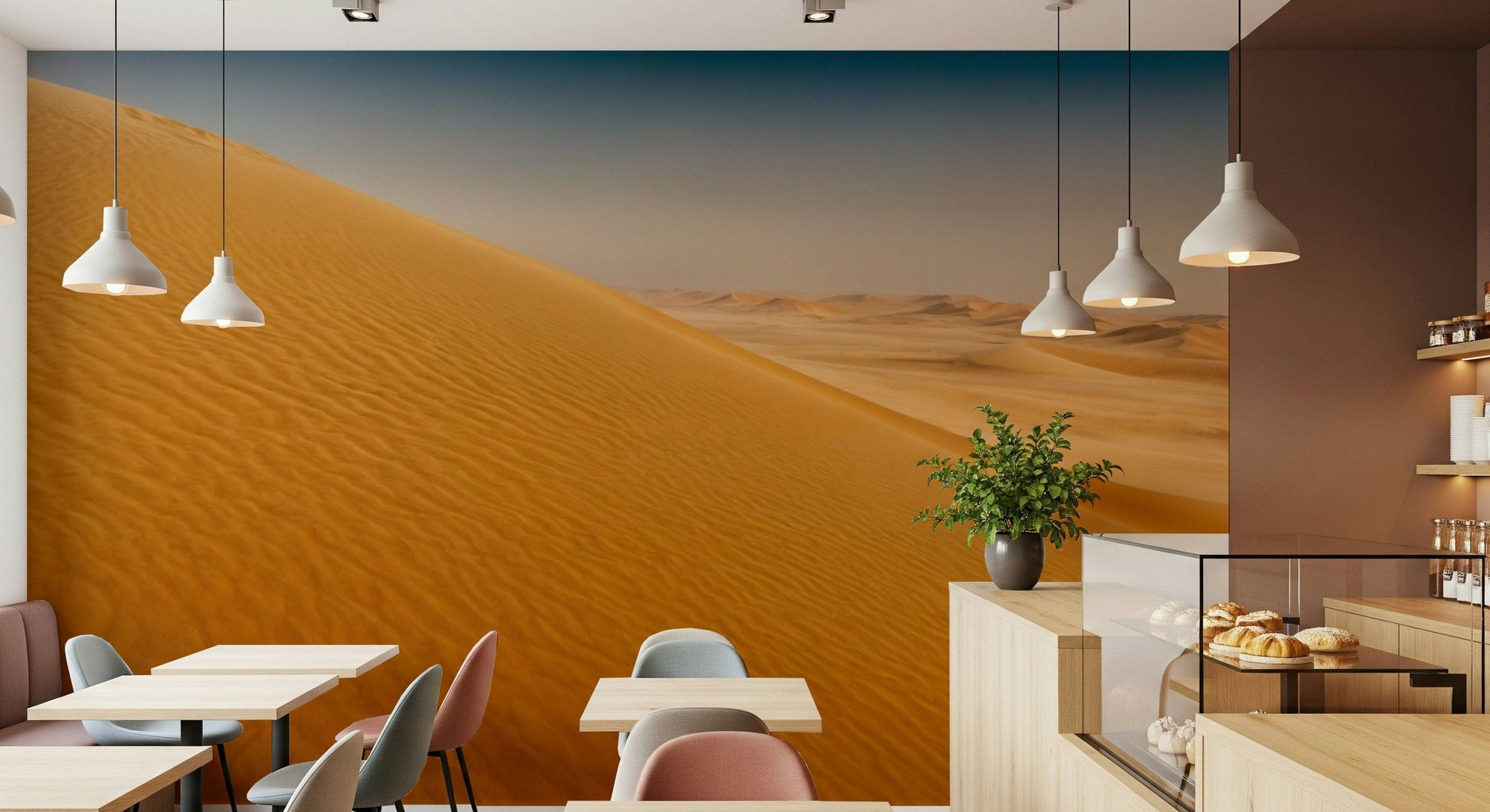 Transform your living space with this stunning desert landscape wallpaper for walls. The design features rolling sand dunes under a serene sky, offering a sense of spaciousness and tranquility. Warm, earthy tones create an inviting atmosphere, perfect for living rooms, bedrooms, or even home offices. The subtle textures in the sand add depth, bringing a touch of nature indoors. This wallpaper complements both modern and rustic décor styles, adding a sense of calm and wonder to any room. It creates a visually appealing backdrop that enhances the overall aesthetics of your space.