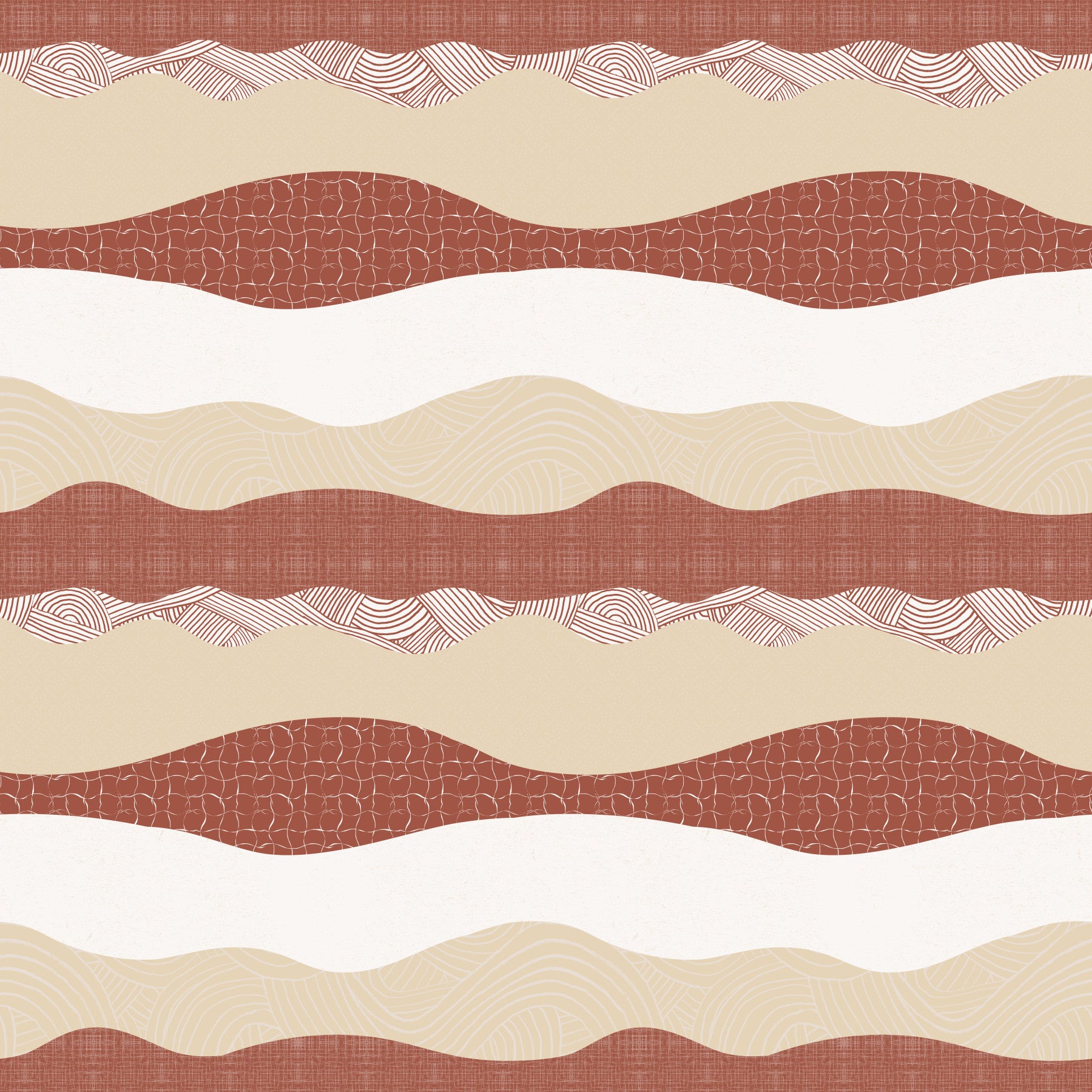 Inspired by the rolling sands of a desert landscape, this wallpaper features a captivating interplay of earthy tones and abstract shapes. The repeating pattern of softly curving lines in terracotta, beige, and off-white mimics the gentle undulations of dunes, creating a tranquil and visually striking design. The varied textures add depth and interest, making it a perfect choice for modern homes seeking a unique and calming atmosphere.