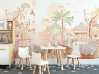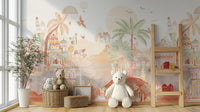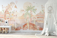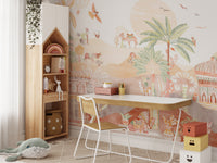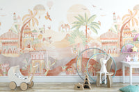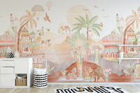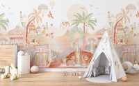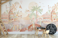 Bring a magical touch to any room with our desert kingdom wallpaper mural. This design captures the essence of an enchanted desert landscape and features intricate Arabian-inspired palaces, majestic camel caravans, and lush palm trees. The soft, earthy tones and detailed illustrations of this exotic palace and camel mural create a warm, whimsical atmosphere perfect for nurseries, playrooms, or creative spaces. Floating hot air balloons and colorful birds add playful elements, making it a captivating backdrop for children's rooms. This whimsical desert landscape wallpaper blends fantasy and nature, offering any space's unique and charming look.