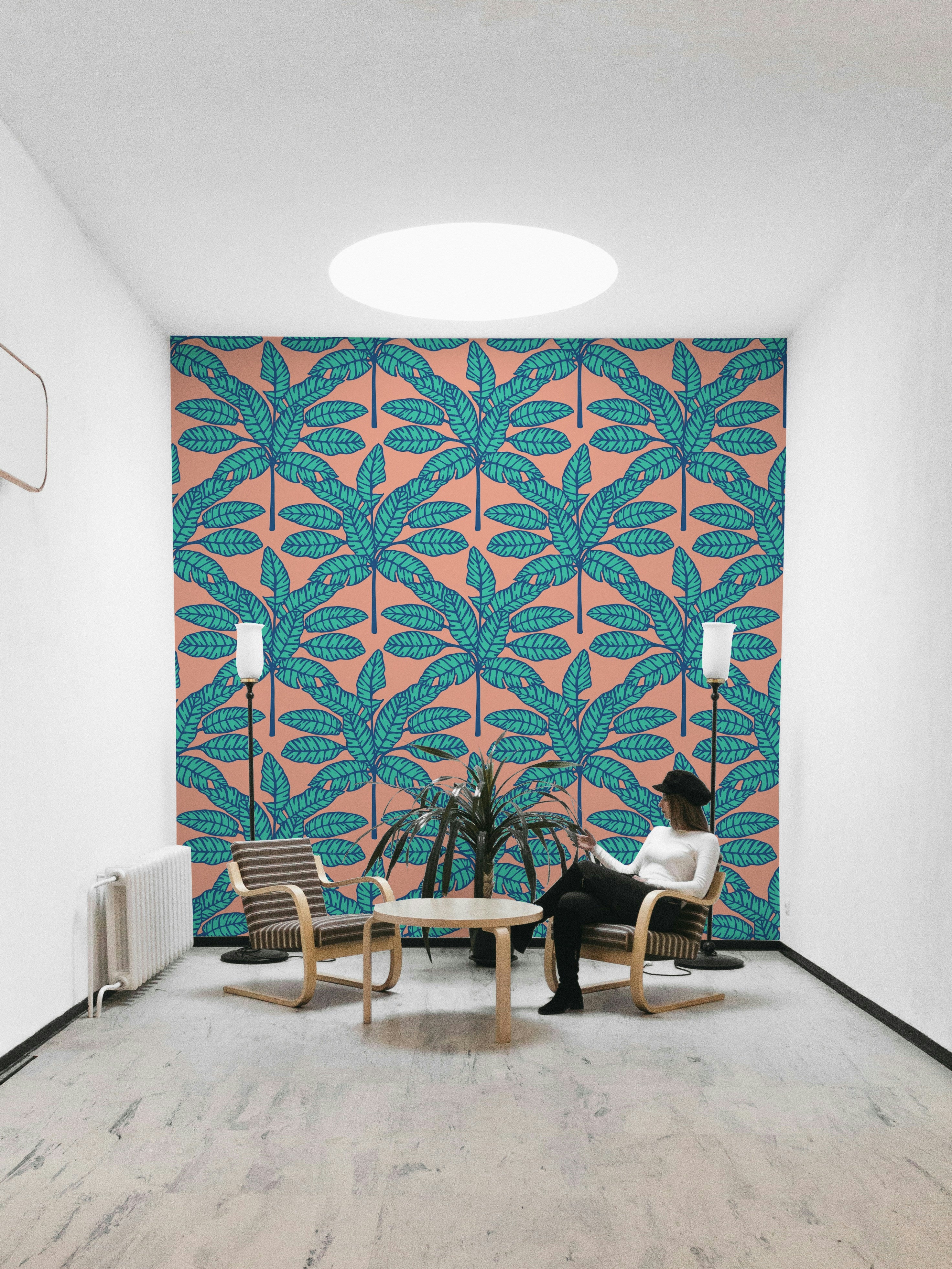 Escape to a vibrant desert oasis with this retro-inspired wallpaper. Stylized tropical leaves in refreshing aqua turquoise and blue burst forth against a warm clay pink backdrop. The mid-century modern aesthetic is perfectly captured through the bold lines and graphic design of the foliage, creating a seamless pattern that evokes a sense of calm and summery escape. This wallpaper is perfect for adding a touch of lush sophistication to any space, bringing a unique blend of desert serenity and tropical exuberance to your spaces. This pattern design is also available in Other Colourways too! Original wallpaper pattern design by Jackie Tahara of UnBlink Studio.
