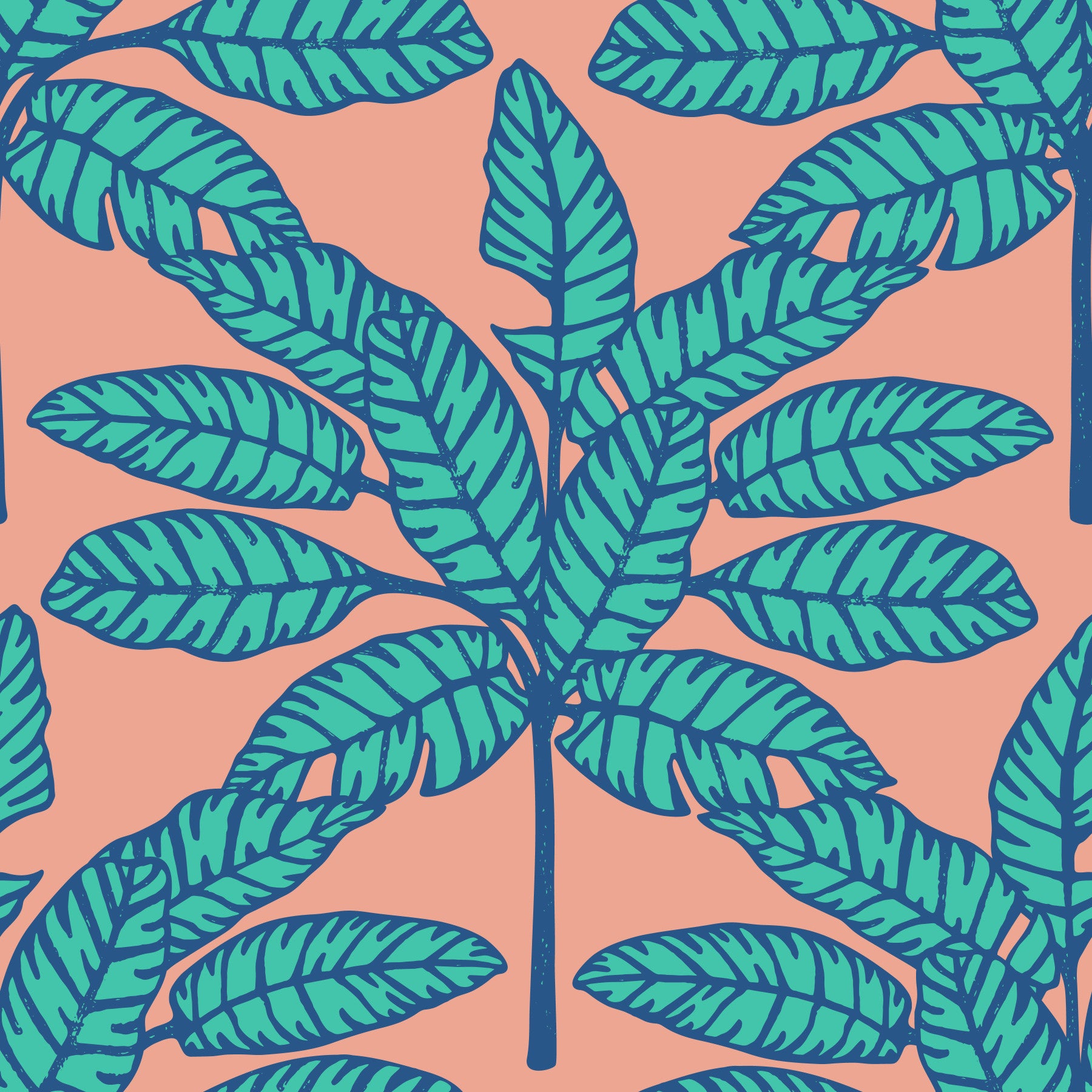 Aqua blue and clay pink tropical leaf design for vibrant, nature-inspired spaces.
