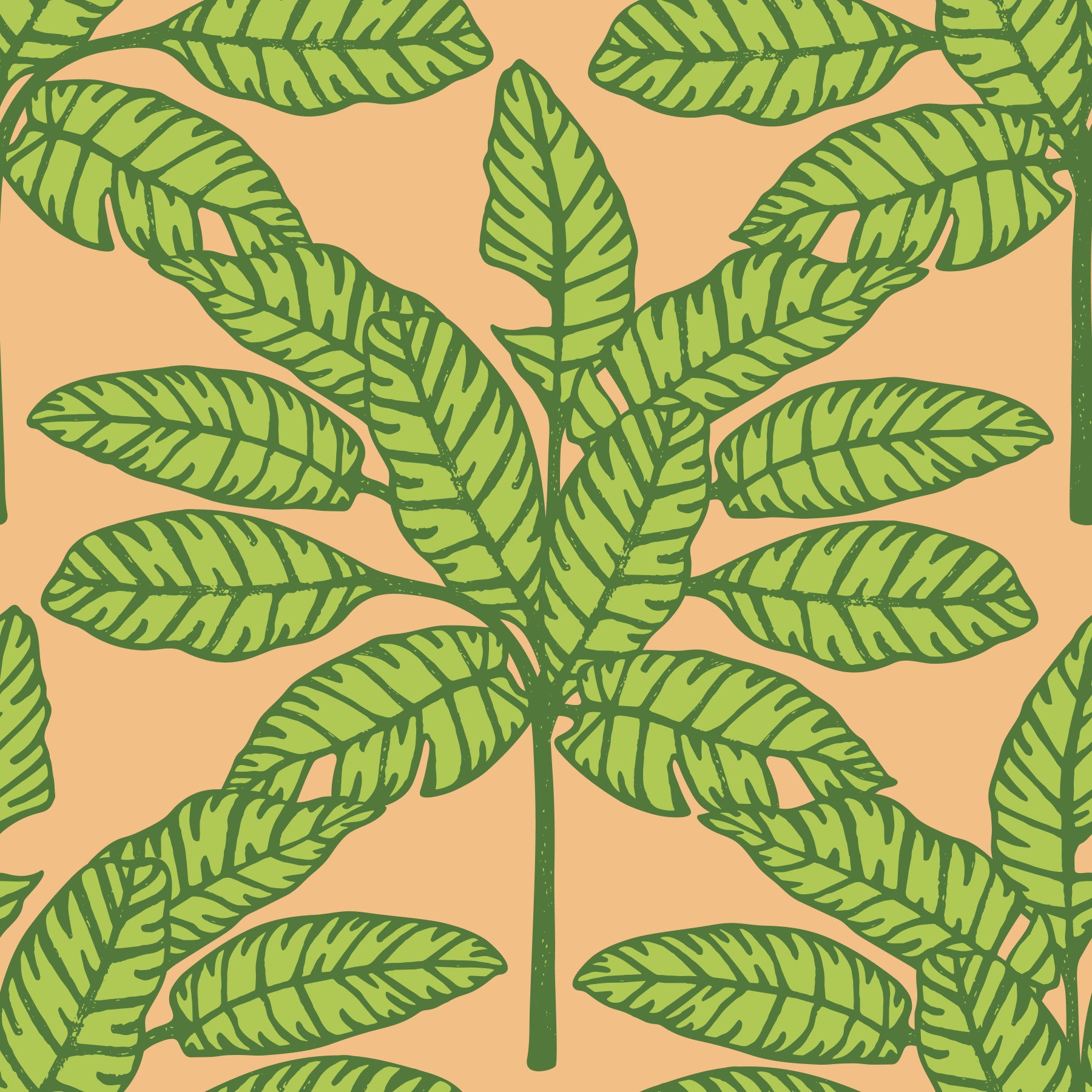 Escape to a retro-inspired desert oasis with this vibrant wallpaper. Bold, stylized tropical leaves in shades of lime green and olive pop against a warm, peachy-orange background. The mid-century modern aesthetic is achieved through the graphic, hand-drawn style of the foliage, creating a sense of calm and playful sophistication. Perfect for adding a touch of vintage tropical charm to any space, this wallpaper evokes feelings of sun-drenched relaxation and a nostalgic escape to a lush, hidden paradise. The repeating pattern ensures a seamless and captivating visual experience. This pattern design is also available in Other Colourways too! Original wallpaper pattern design by Jackie Tahara of UnBlink Studio.