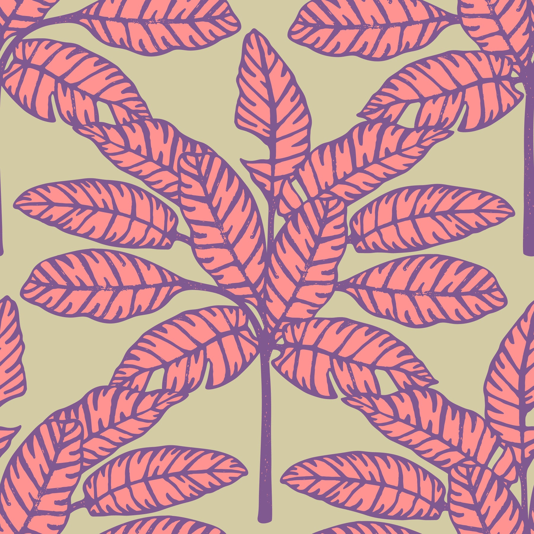 Escape to a vibrant desert oasis with this retro mid-century modern wallpaper. Stylized tropical leaves in coral pink and muted purple burst across a calming cream background, creating a visually striking yet serene atmosphere. The bold graphic style evokes a sense of vintage charm, transporting you to a sun-drenched paradise. Perfect for adding a touch of playful sophistication to any space, this design blends the unexpected warmth of desert hues with the lushness of tropical flora, resulting in a uniquely captivating and timeless aesthetic. The hand-drawn style adds texture and a hint of bohemian flair. This pattern design is also available in Other Colourways too. Original wallpaper pattern design by Jackie Tahara of UnBlink Studio.
