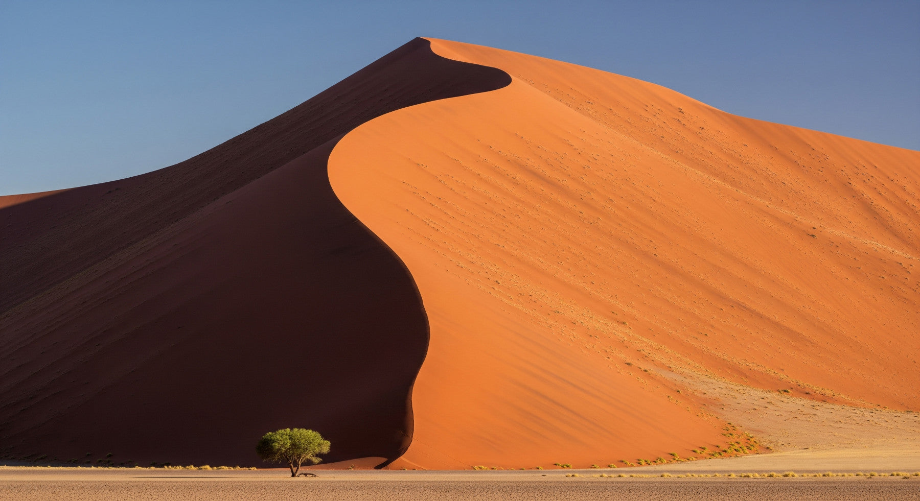 Transform your rooms with this breathtaking wallpaper for walls. A colossal, sun-kissed dune dominates the scene, its sharp edges softened by the gentle light. A lone tree adds a touch of life to the arid landscape, creating a captivating contrast. The colour palette features warm oranges, browns, and tans, balanced by a clear blue sky. It adds depth and visual interest. This wallpaper elevates living rooms, hallways, or home offices. It brings a sense of tranquility and adventure, making any space feel like an escape to the wilderness.