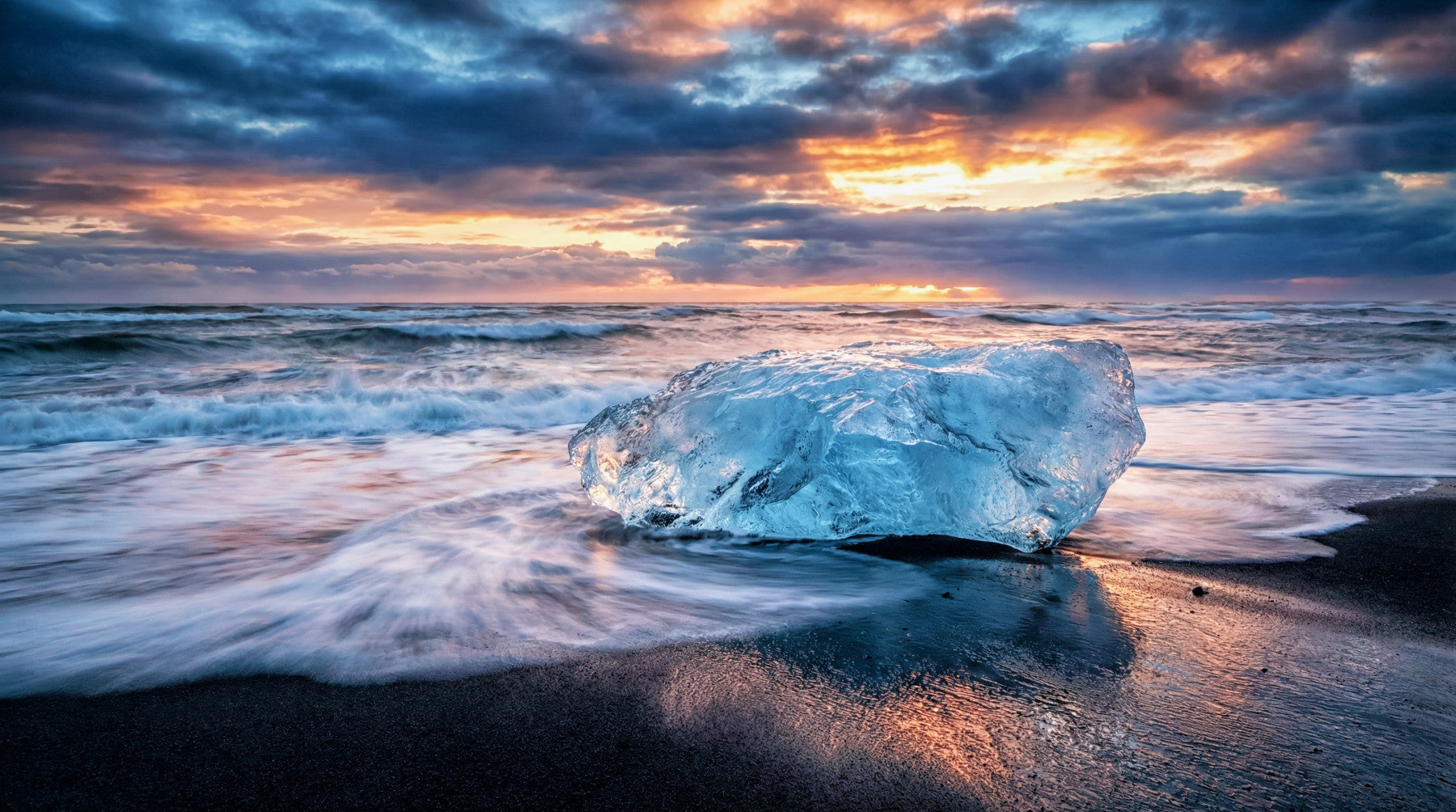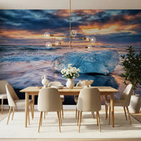 Transform your living space with this serene landscape. The dramatic sky and icy textures bring the raw beauty of Iceland's Diamond Beach directly to your walls. Observe how the sunrise casts warm hues on the ice, providing both a tranquil mood and a conversation piece. This unique wallpaper for walls provides a contemporary, upscale look, fitting for living rooms, bedrooms, or even a home office. Its sophisticated colour palette complements neutral or minimalist interiors, enhancing the room with a sense of expansiveness. This wallpaper makes any room a peaceful retreat.