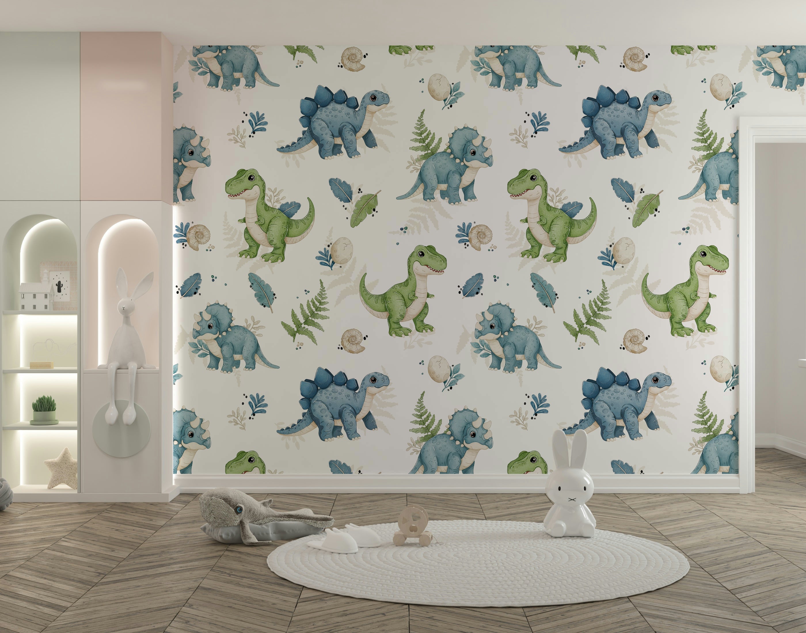 Add a roar of cuteness to your little one’s room with Dino Pals—a delightful dinosaur wallpaper crafted for modern nurseries. Featuring cheerful green and blue dinos, leafy ferns, and dino eggs on a crisp white background, this design sparks imagination while keeping things sweet and stylish. Whether you're a parent designing a cozy nursery or a decorator styling a fun playroom, Dino Pals offers easy peel-and-stick installation and a renter-friendly experience. This charming nursery wallpaper is perfect for creating a playful yet calming space your child will adore.
