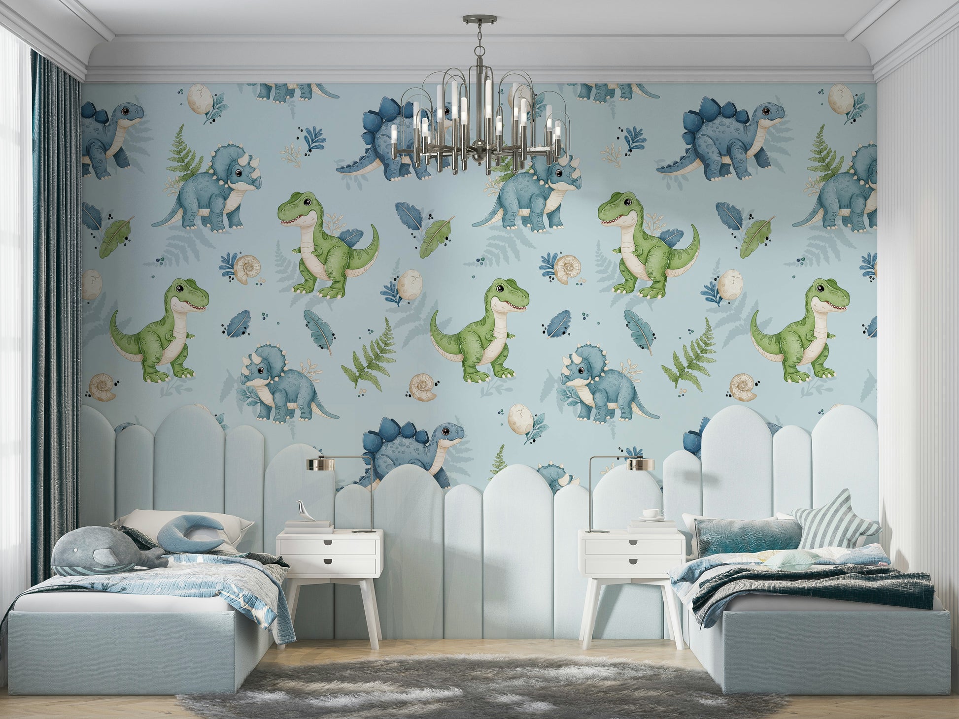 Bring a gentle sense of adventure to your child’s space with Dino Pals Blue, a sweet and stylish dinosaur wallpaper designed for nurseries and kids rooms. Featuring hand-painted blue and green dinosaurs with leafy fern details and dino eggs, this design rests on a soft blue background that soothes and delights. The peel-and-stick format makes decorating effortless—perfect for renters and DIY-friendly parents. Whether you're creating a dinosaur-themed nursery or refreshing a toddler’s playroom, Dino Pals Blue blends fun and comfort for a charming prehistoric look.