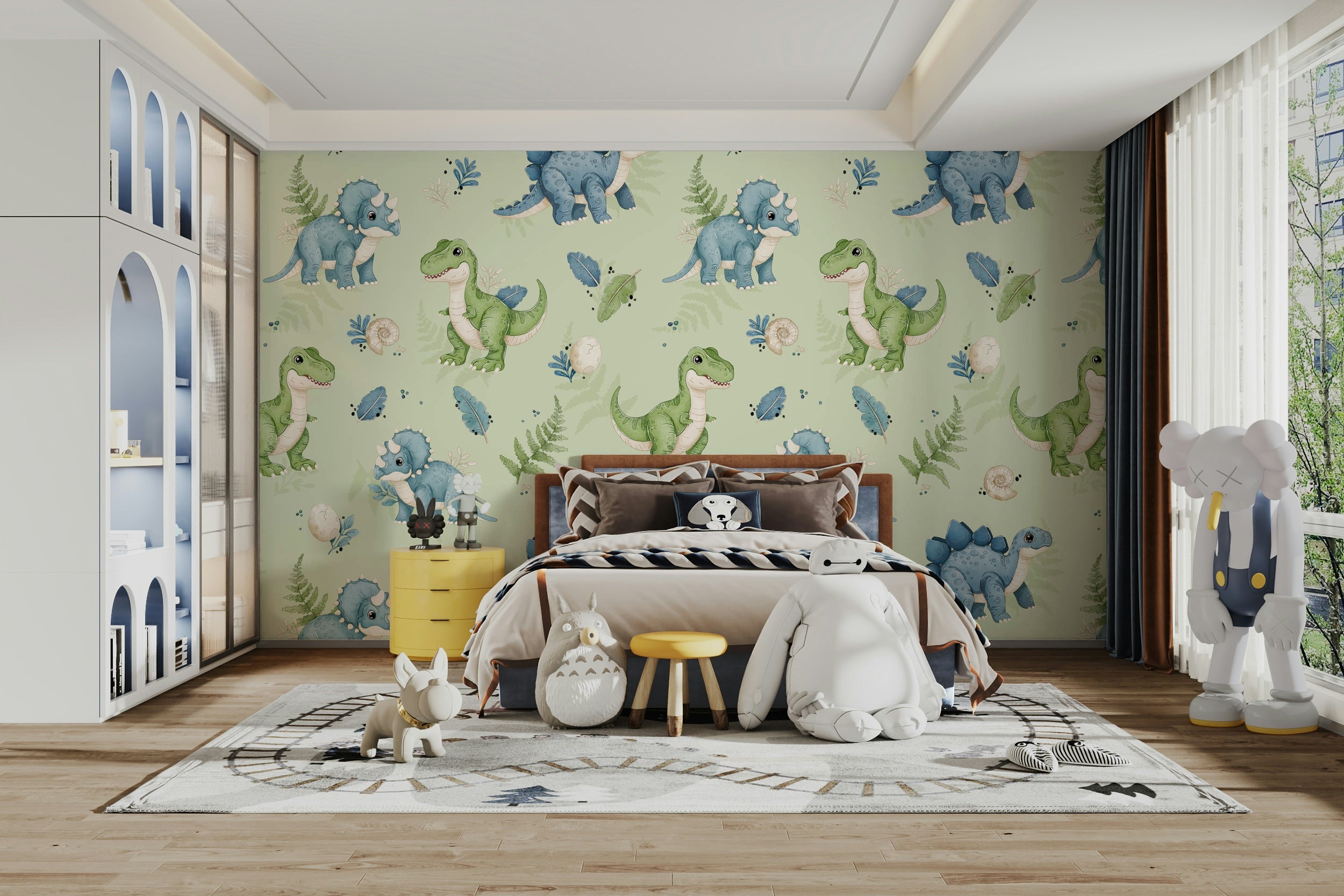Create a playful prehistoric escape with Dino Pals Green, a charming dinosaur wallpaper designed for kids rooms and nurseries. Featuring a cheerful mix of green and blue dinosaurs, leafy ferns, and dino eggs set against a calming mint-green background, this design brings both whimsy and softness to any space. Ideal for curious little explorers, it’s made with a peel-and-stick finish—easy to apply, remove, and renter-friendly. Whether you're designing a dino-themed nursery or a lively kids’ playroom, this wallpaper adds personality and fun in every detail.