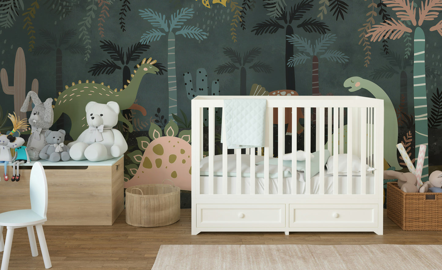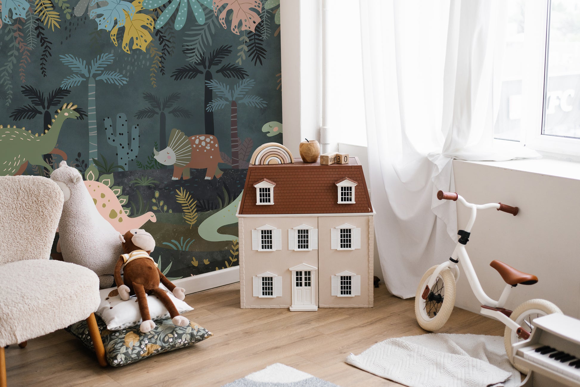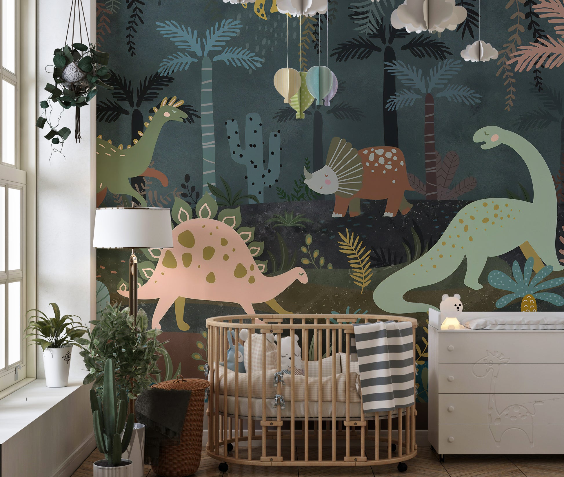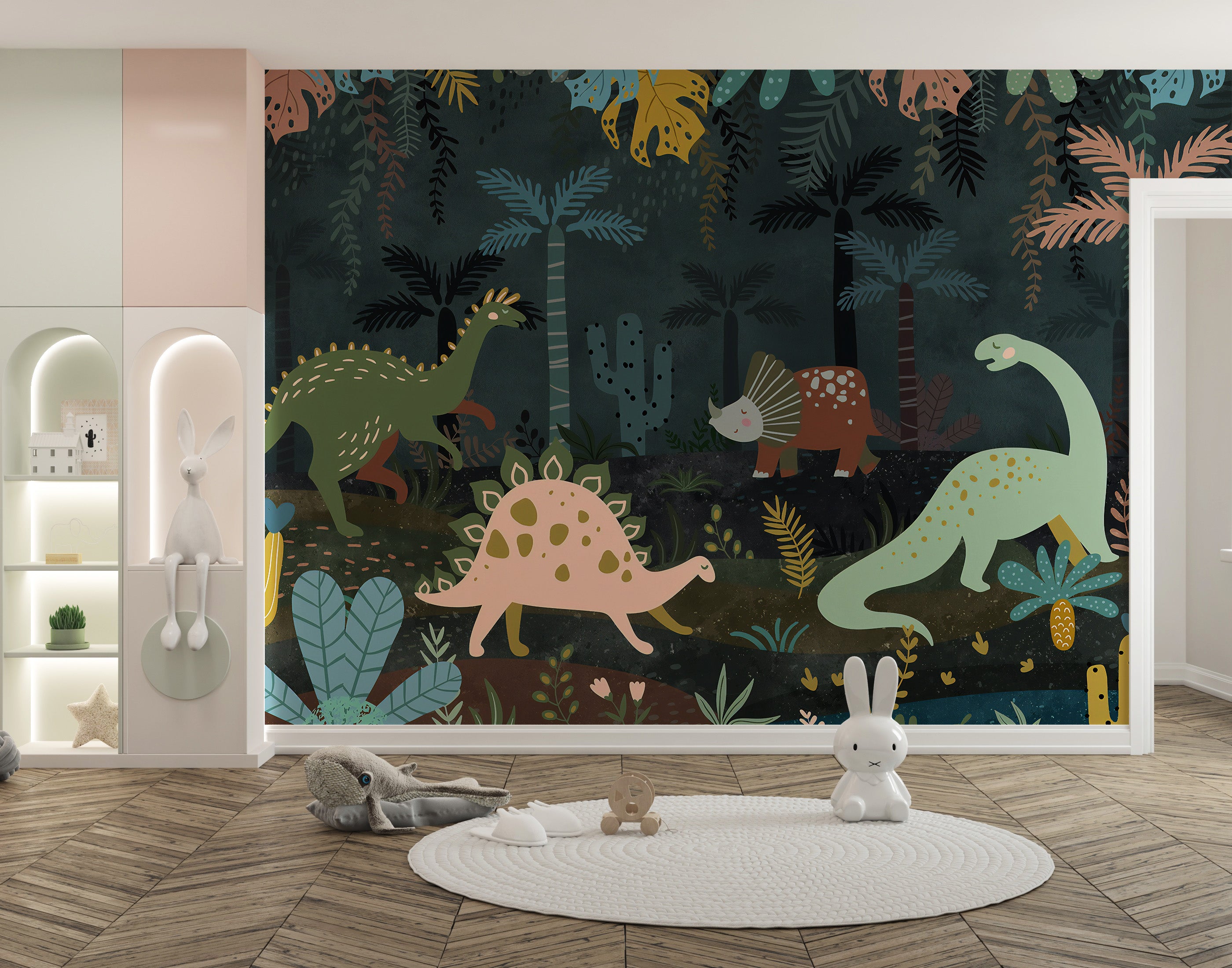 Say goodbye to boring walls and hello to a thrilling prehistoric adventure with our Dino World Night adventure mural wallpaper! Perfect for a playroom, this playful and eye-catching wallpaper features all your child's favorite dinosaurs in a lively nighttime setting. The detailed and vibrant design will transport your little ones to a world where they can imagine and play with these ancient creatures.