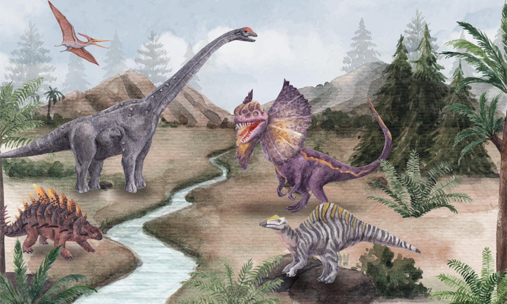 Experience a prehistoric journey with our dinosaur era wall mural. Ideal for sparking young minds, this captivating dinosaur wallpaper mural showcases a lush Mesozoic landscape teeming with majestic dinosaurs. The detailed illustration promises a visual feast, enhancing any room's appeal while fueling curiosity and wonder in the world of these ancient giants. It's a timeless addition to your home, offering both education and enjoyment in one striking visual statement.