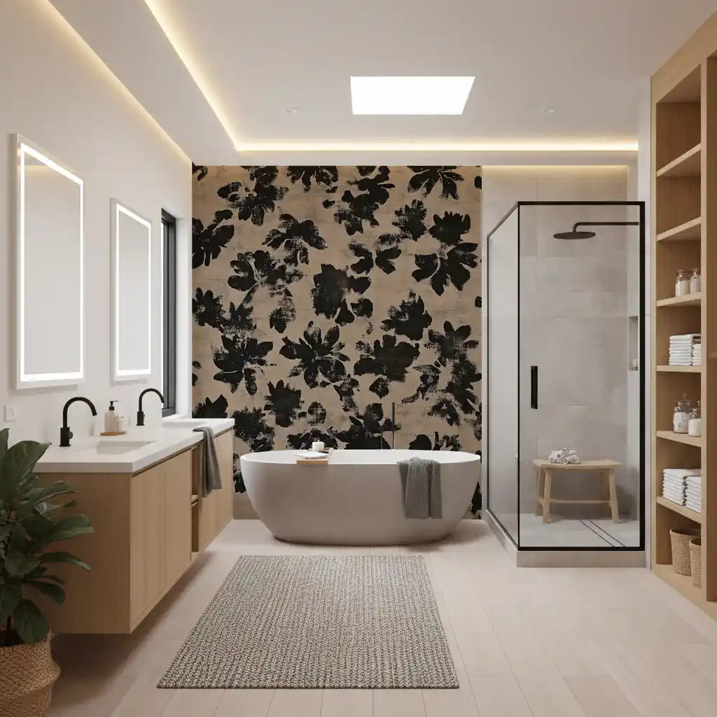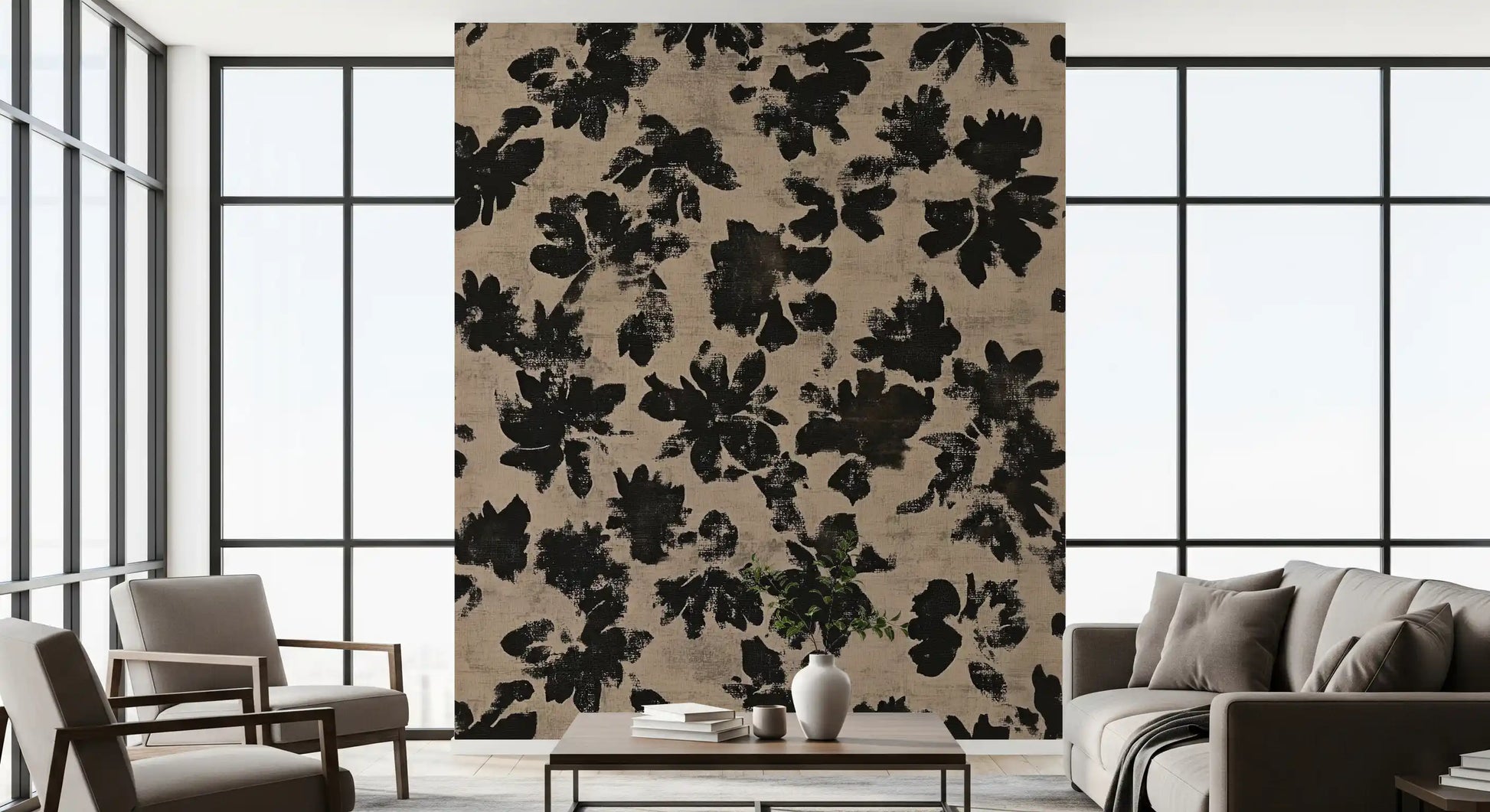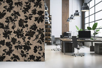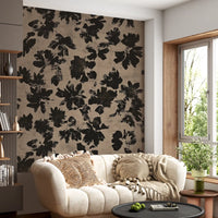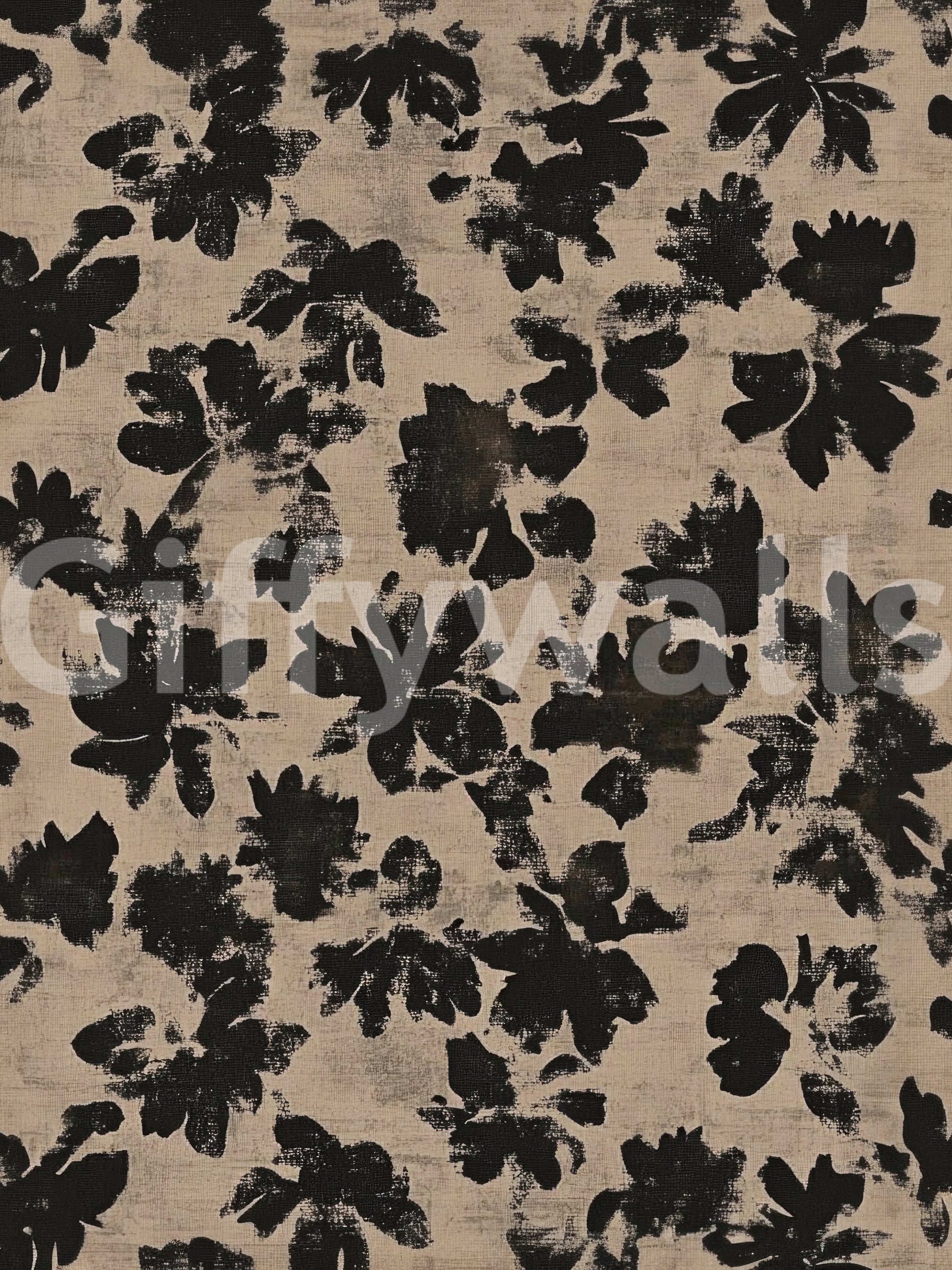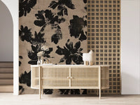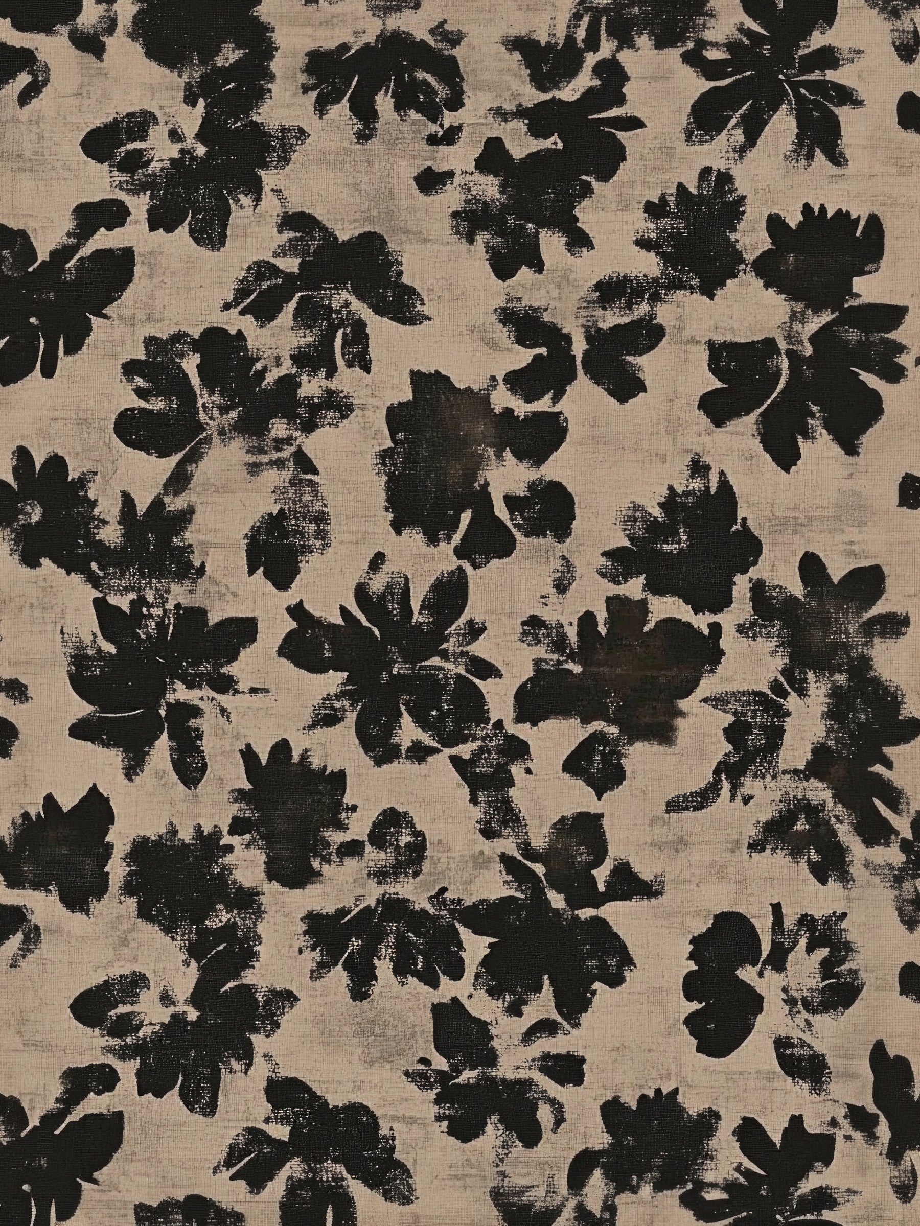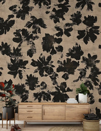 Transform your living space with this striking wallpaper, featuring an abstract floral design. Bold black silhouettes of organic blooms stand out against a distressed beige background. The brushstroke texture gives the pattern a hand-painted, rustic feel, adding depth and character to any room. This design blends modern aesthetics with a natural, earthy charm. Perfect for creating an accent wall in a minimalist living room, adding sophistication to a bedroom, or bringing an artistic touch to a contemporary dining area. The high-contrast palette ensures this unique pattern becomes a captivating focal point, enhancing your interior design with subtle elegance.