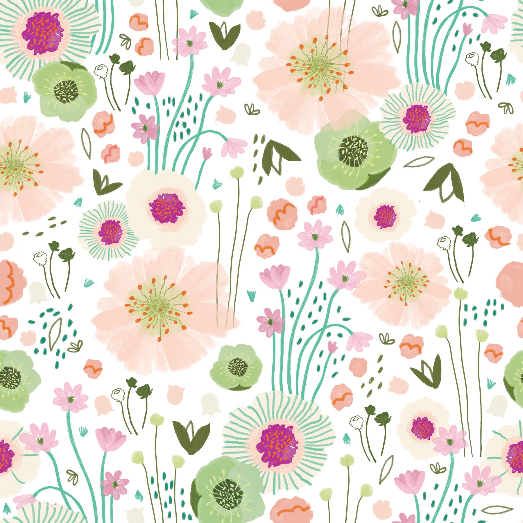 Embrace a whimsical escape with 'Ditsy Dream - White,' a charming floral wallpaper. Delicate pastel blossoms in shades of peach, pink, and mint green dance across a crisp white background. Loose, hand-painted brushstrokes give each flower a unique, slightly imperfect charm, enhancing the dreamy, carefree aesthetic. Tiny details like scattered dots and whimsical stems add to the overall feeling of lightheartedness and simple beauty. This wallpaper is perfect for creating a serene and subtly romantic atmosphere in any digital space.