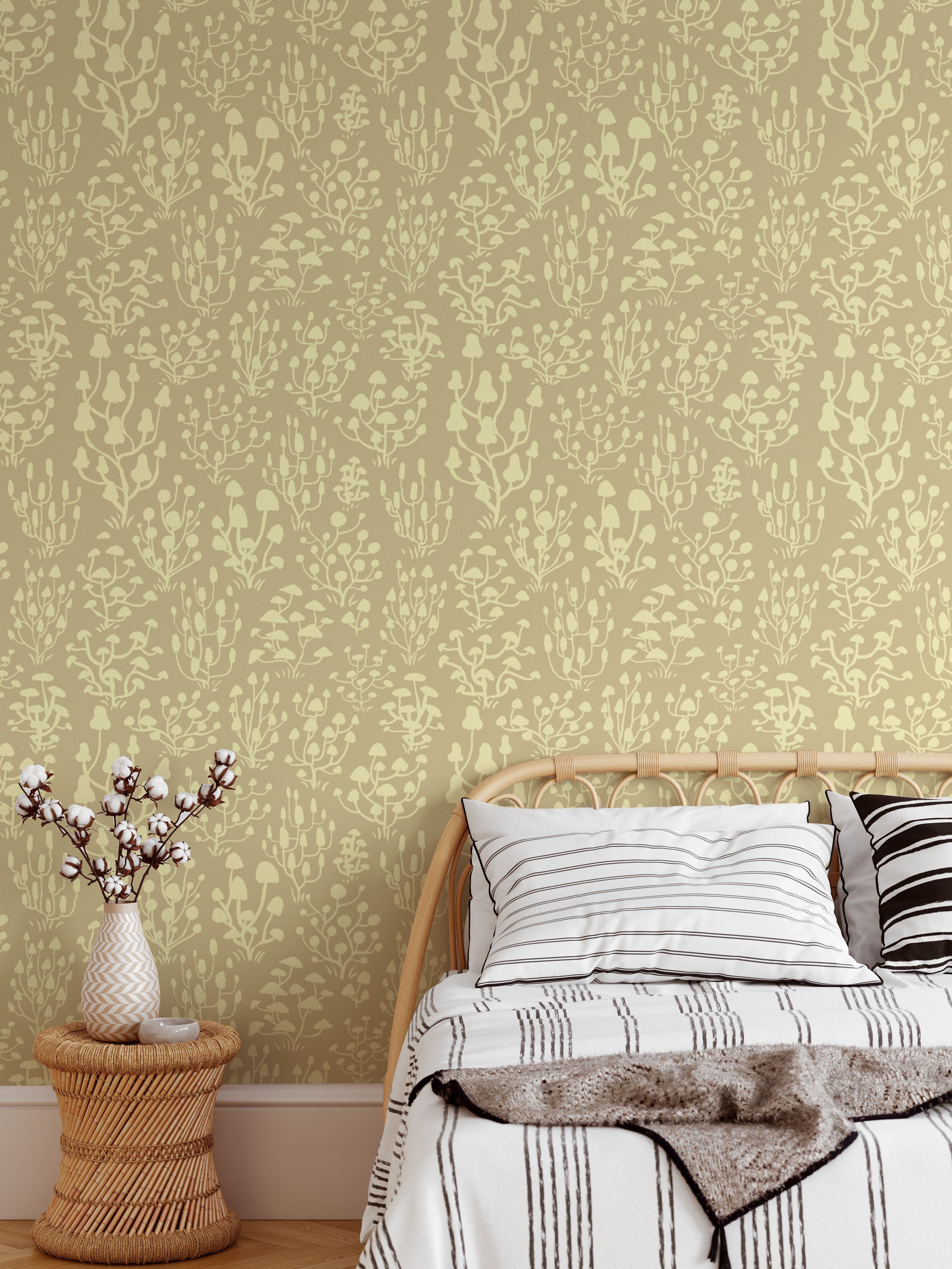 Nature-inspired yellow mushroom wallpaper with ditsy design.