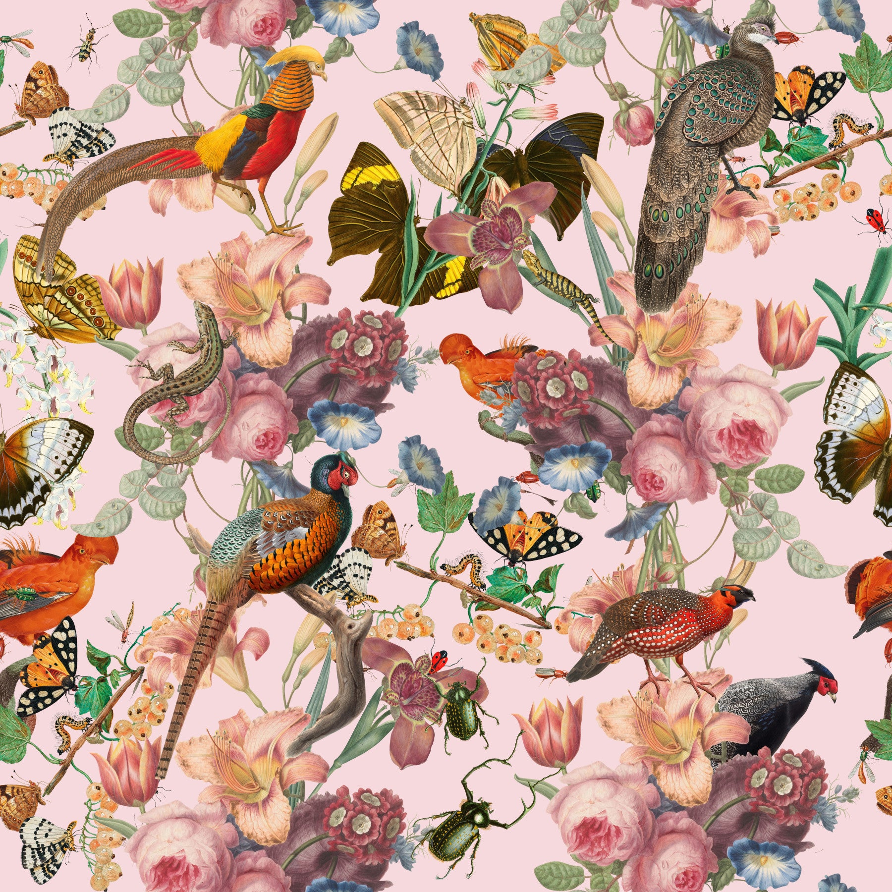 Indulge in the vibrant tapestry of 'Divertirs,' a wallpaper design that celebrates the whimsical beauty of nature's intricate details. A symphony of richly colored flowers – roses, lilies, and tulips – intertwine with exotic birds, including resplendent pheasants and a peacock-like species, creating a lively scene. Butterflies with delicate wings flutter alongside busy beetles and graceful lizards, adding a touch of playful dynamism. The soft blush pink background enhances the overall elegance and creates a serene yet captivating atmosphere, perfect for adding a touch of sophisticated charm to any space. This artistic blend of flora and fauna offers a delightful escape and a vibrant visual treat.