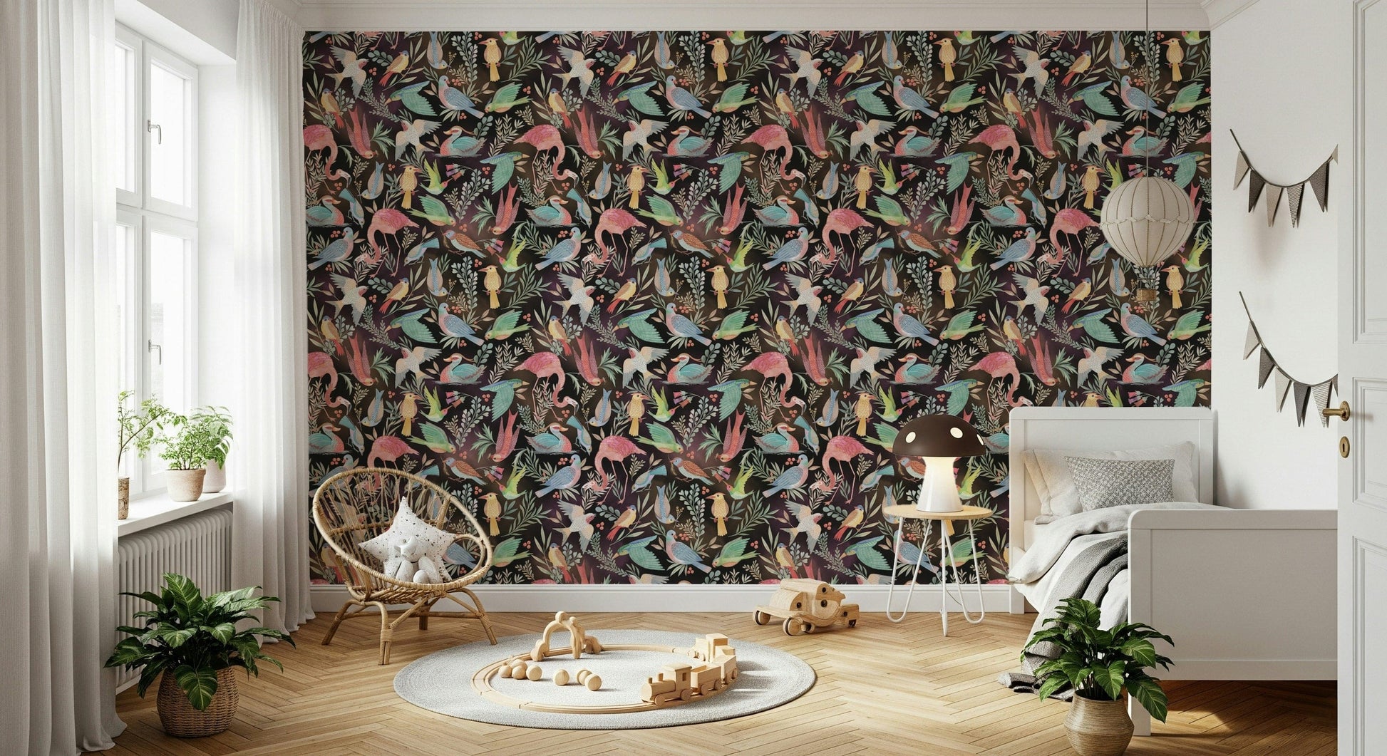 Embark on a nocturnal avian adventure with "Dream Dark Birdwatcher's." This captivating wallpaper showcases a vibrant tapestry of exotic birds—flamingos, hummingbirds, and ducks—rendered in a dreamy, watercolour style against a rich, dark background. Intricate floral details intertwine with the feathered creatures, creating a surreal and enchanting scene. The colours are both bold and muted, offering a unique blend of fantasy and elegance. Perfect for adding a touch of whimsical mystery to any digital device.