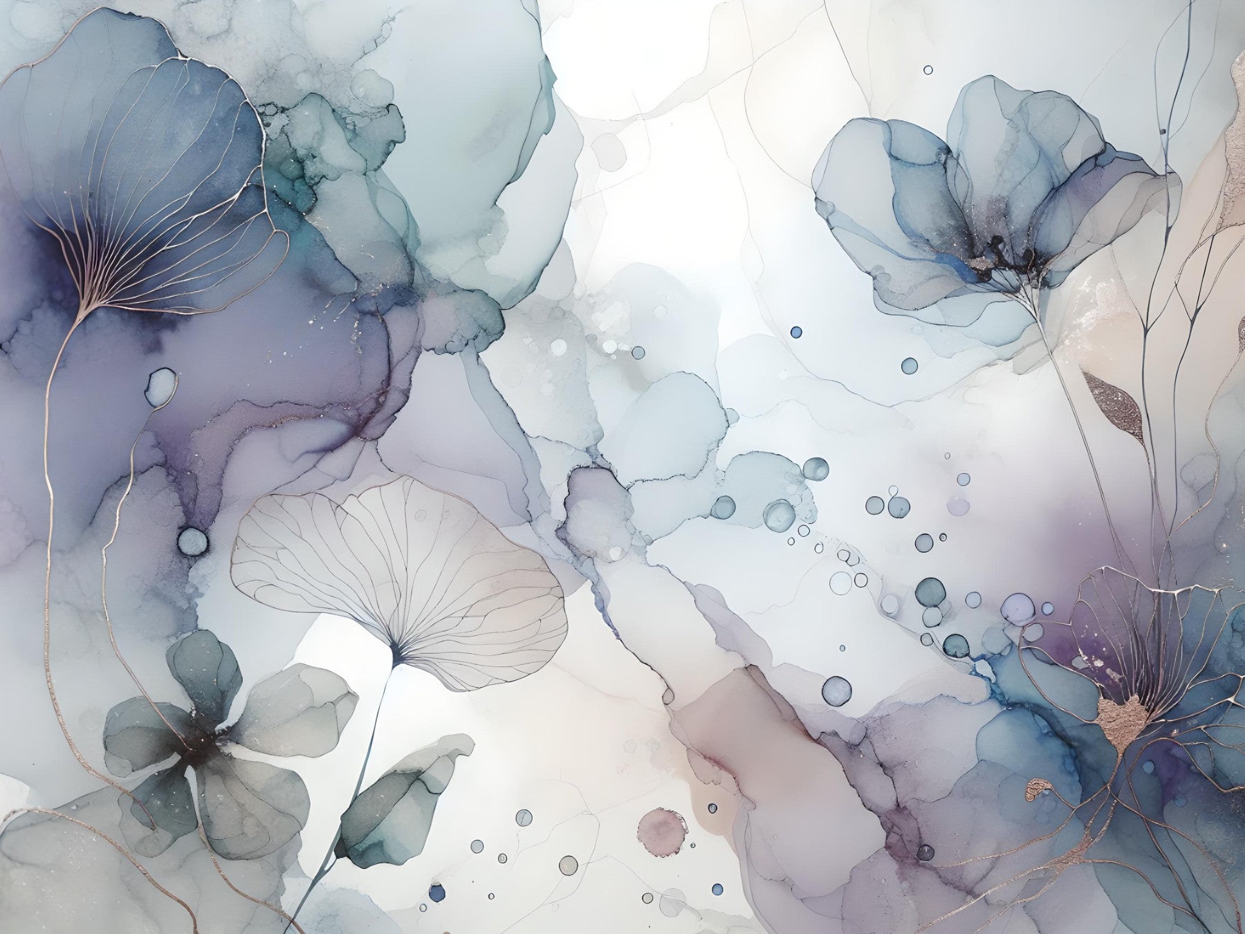This ethereal wallpaper showcases a mesmerizing blend of abstract floral art and fluid watercolor techniques. Delicate, translucent blooms in shades of dusty blue, soft lavender, and rose gold float amidst swirling clouds of color. The interplay of organic lines and flowing shapes creates a sense of serene movement, bringing a touch of calming elegance to any space. Subtle metallic accents add a touch of luxurious shimmer, enhancing the dreamy atmosphere. Perfect for bedrooms, living rooms, or any area needing a tranquil and sophisticated touch.