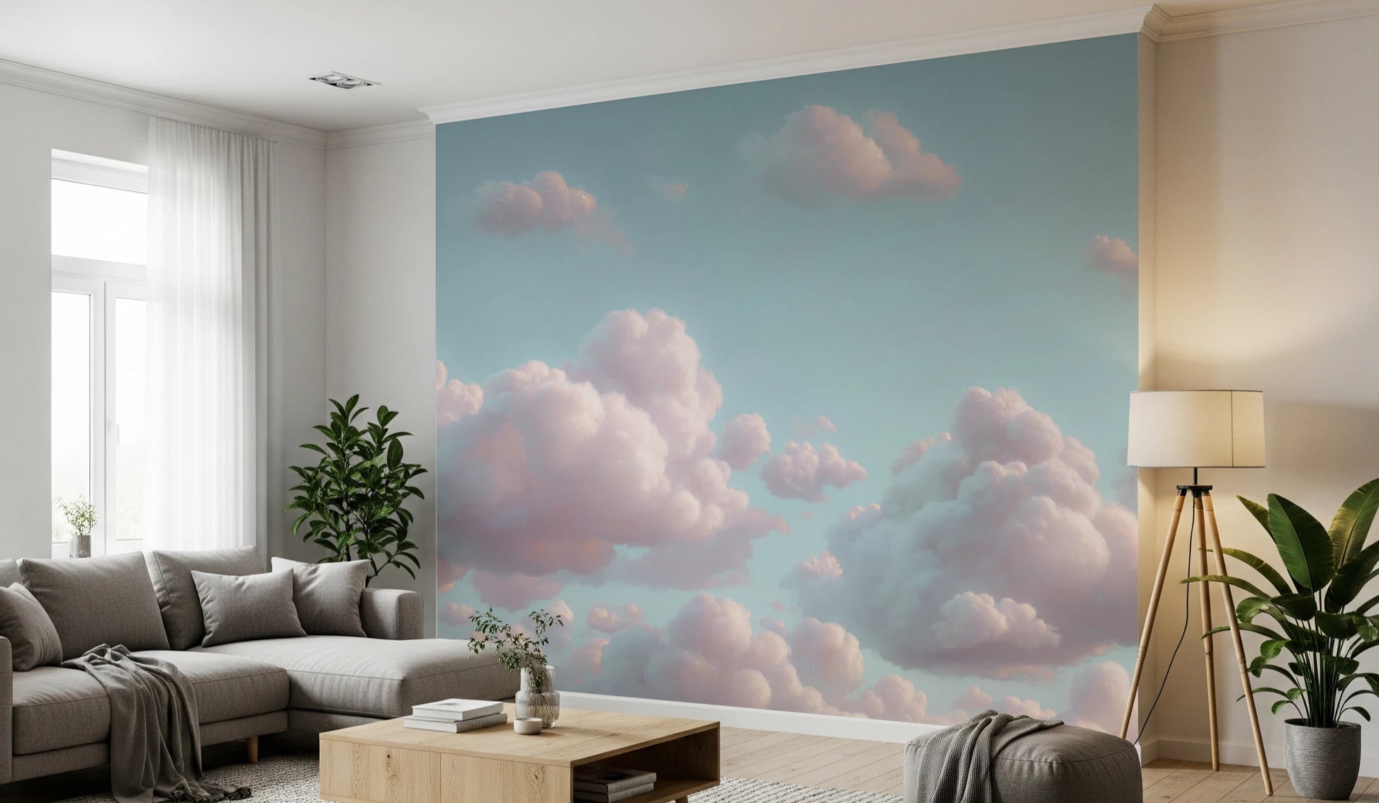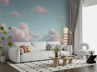 Blue sky with puffy clouds. Transform your walls with this serene cloudscape. Soft pink clouds drift across a tranquil pale blue sky, creating an atmosphere of calm and wonder. This wallpaper for walls brings an ethereal, dreamlike quality to any room. The subtle colour palette makes it a perfect choice for bedrooms, nurseries, or meditation spaces, where you want to foster relaxation. Imagine this beautiful design in a living room, adding a touch of gentle sophistication and airy spaciousness. Let this wallpaper uplift your interior with its quiet beauty.