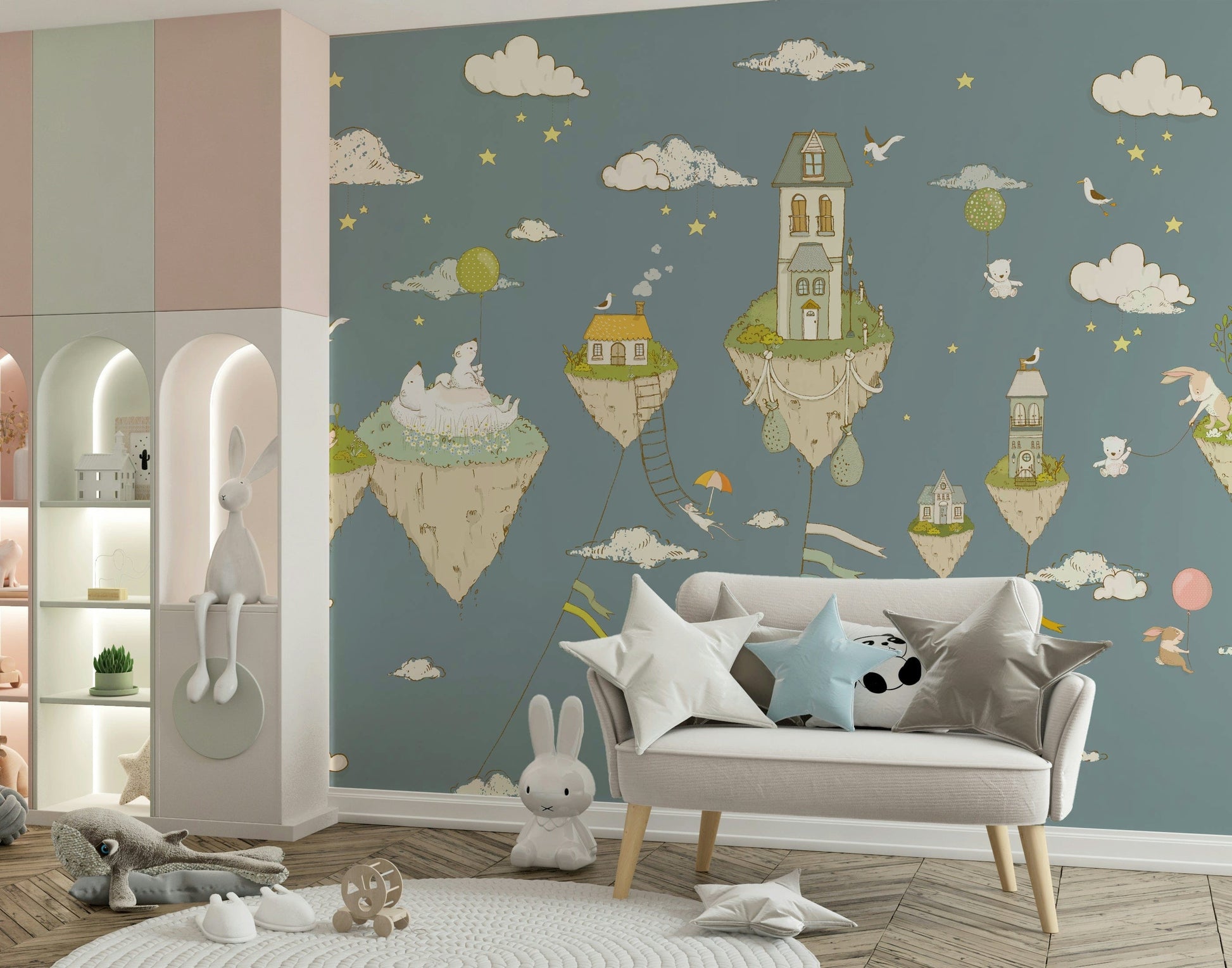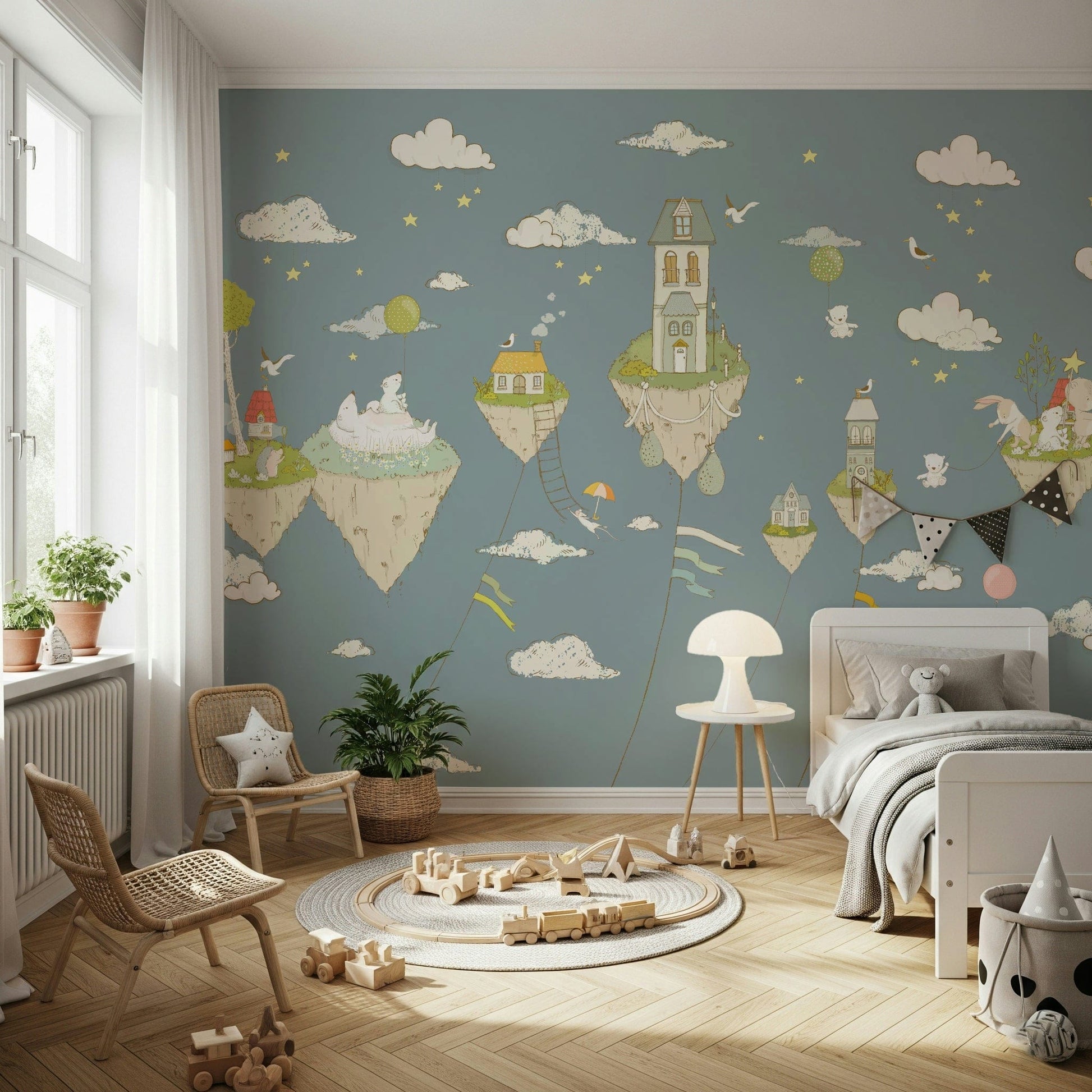 Enter a land of floating houses and friendly creatures with this enchanting wallpaper for walls. Featuring sweet illustrations, clouds, and stars on a calming blue canvas, it sparks imagination and brings a sense of wonder. The gentle palette of blues, greens, and beige makes it perfect for kids' bedrooms or playrooms. Create a magical haven with this design that beautifully complements various interior design themes, adding a unique focal point to your home.