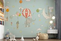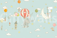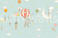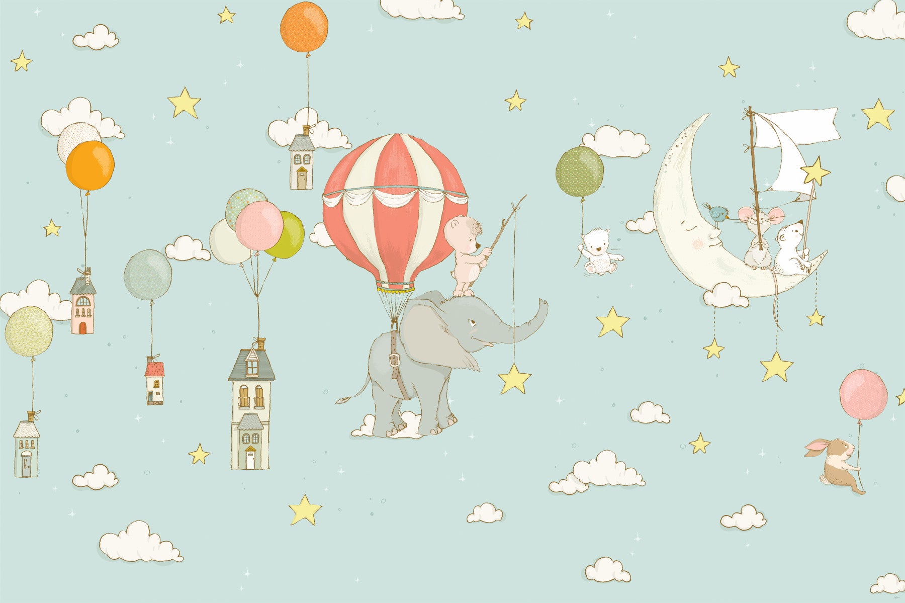 Float away with this dreamy wallpaper for walls! Delicate illustrations show animals soaring through a pastel sky filled with stars, clouds, and houses on balloons. Soft shades of blue, pink, and yellow create a calming effect. It's ideal for a nursery or kids' room. The whimsical design brings a touch of magic and complements any cosy interior.