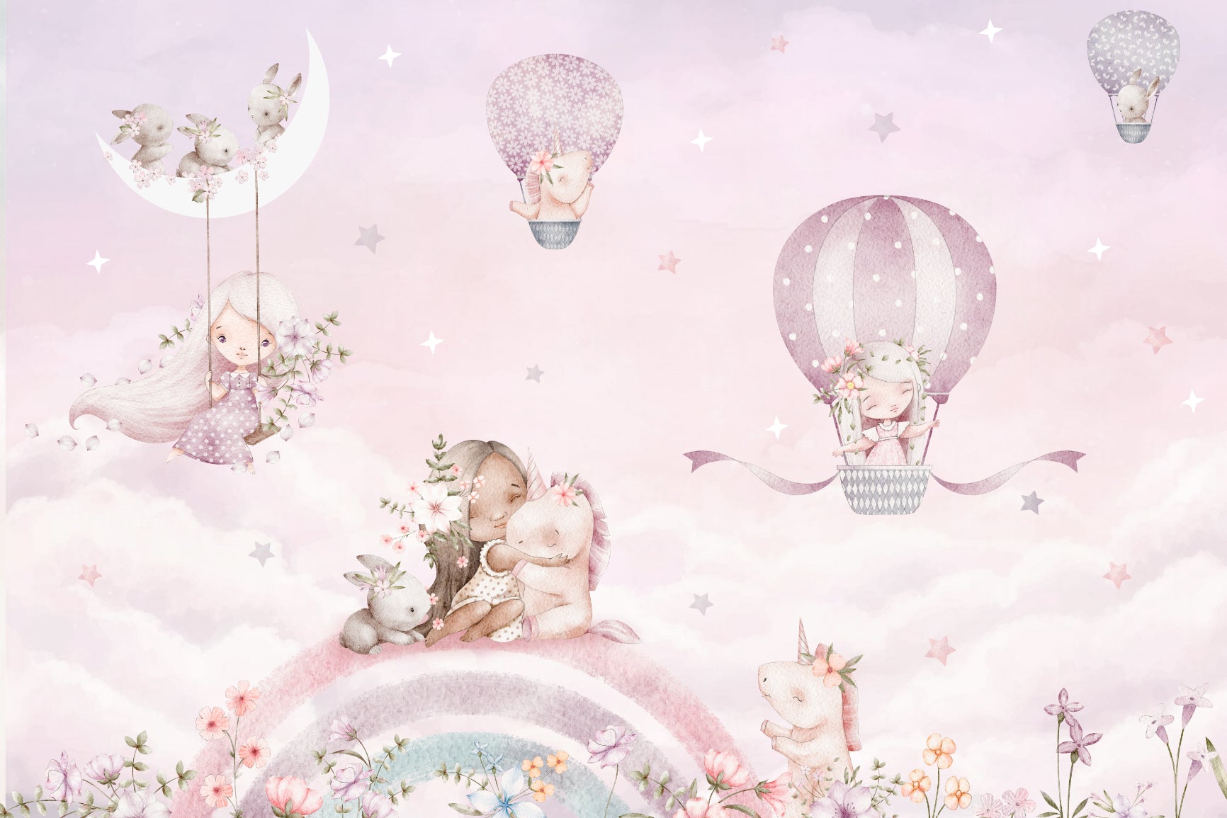 The dreamy unicorn & balloon wallpaper creates a magical setting with soft pastel clouds, floating hot air balloons, and adorable unicorns. Gentle watercolor strokes bring a fairy tale touch, perfect for a girls' bedroom wallpaper or nursery. A moon swing, twinkling stars, and delicate florals enhance the charm, offering a peaceful atmosphere. The hand-drawn details blend beautifully with a rainbow and unicorn wallpaper theme, adding warmth and fantasy to the walls. Ideal for creating a dreamy space, this fantasy kids' wallpaper brings unicorns, bunnies, and floating balloons together in a whimsical pastel world filled with soft hues.