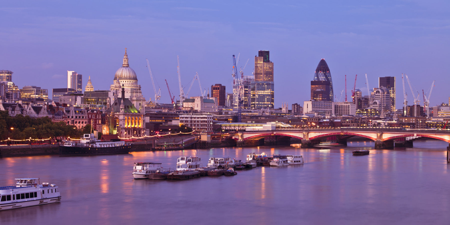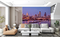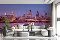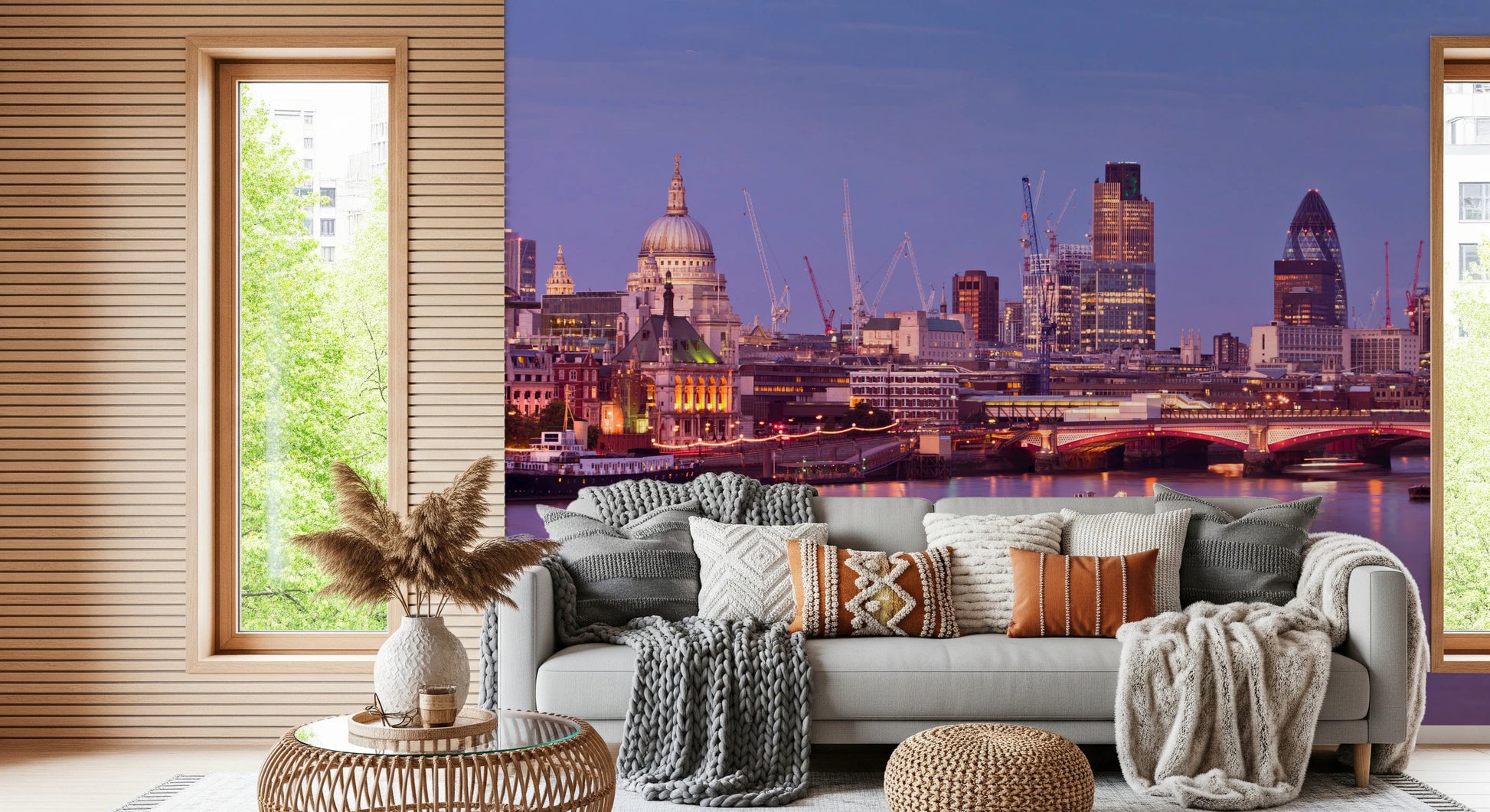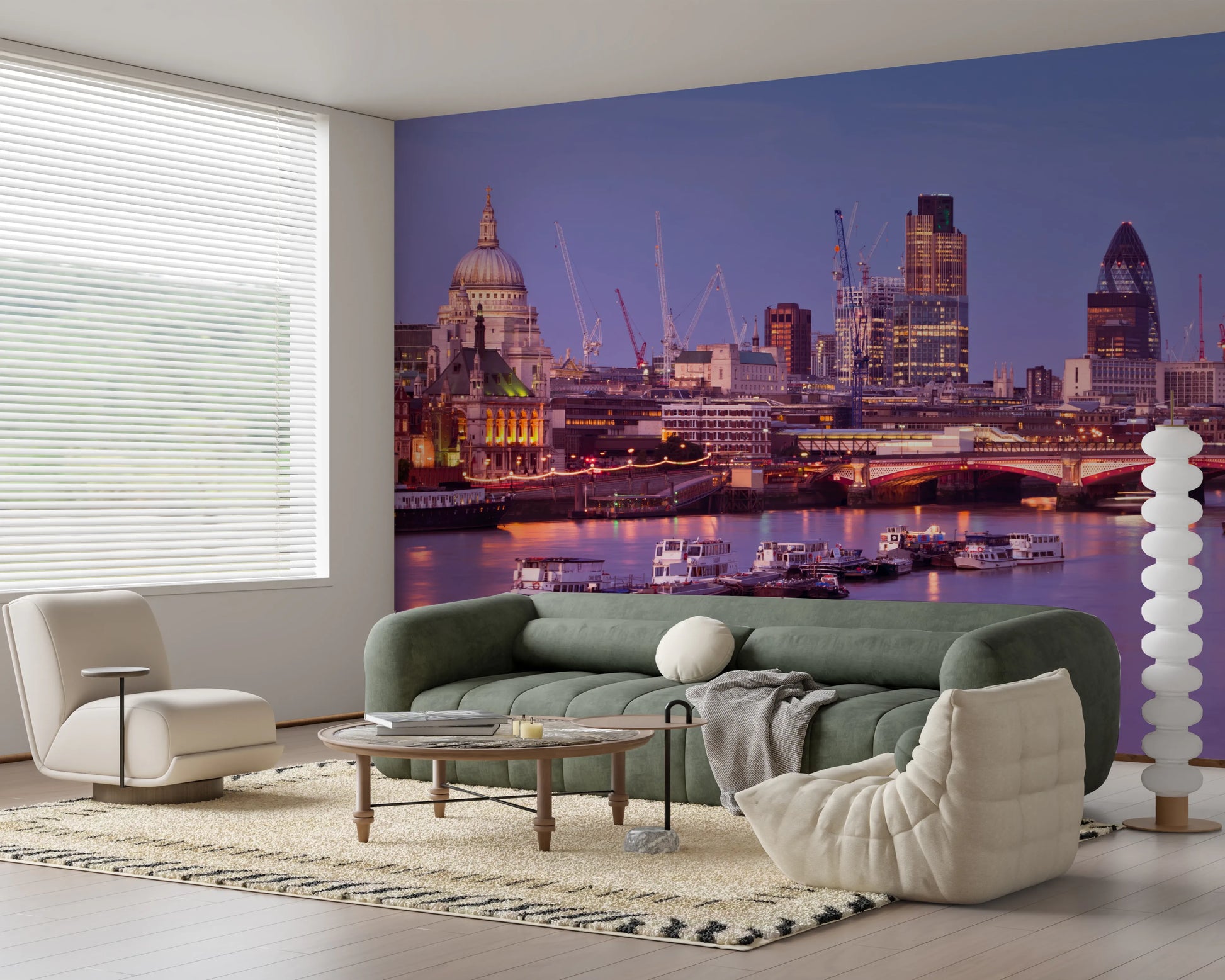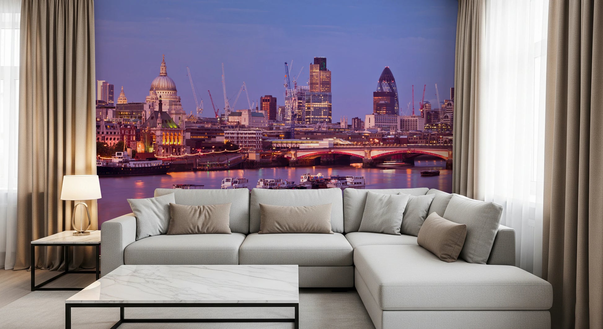 London skyline over River Thames and Blackfriars bridge at dusk. Immerse yourself in the serene beauty of "Dusk on the Thames", a stunning cityscape bathed in the soft hues of twilight. This captivating piece captures the iconic skyline of London as the sun dips below the horizon, casting a mesmerising glow upon the river. From the majestic dome of St. Paul's Cathedral to the modern silhouettes of the Gherkin and other skyscrapers, the image offers a striking blend of historical grandeur and contemporary architecture. The illuminated bridges and boats gently bobbing on the water add depth and movement, creating a dynamic yet tranquil scene that will transform any room into a sophisticated sanctuary. Let this view of London at its most enchanting become a focal point in your home.