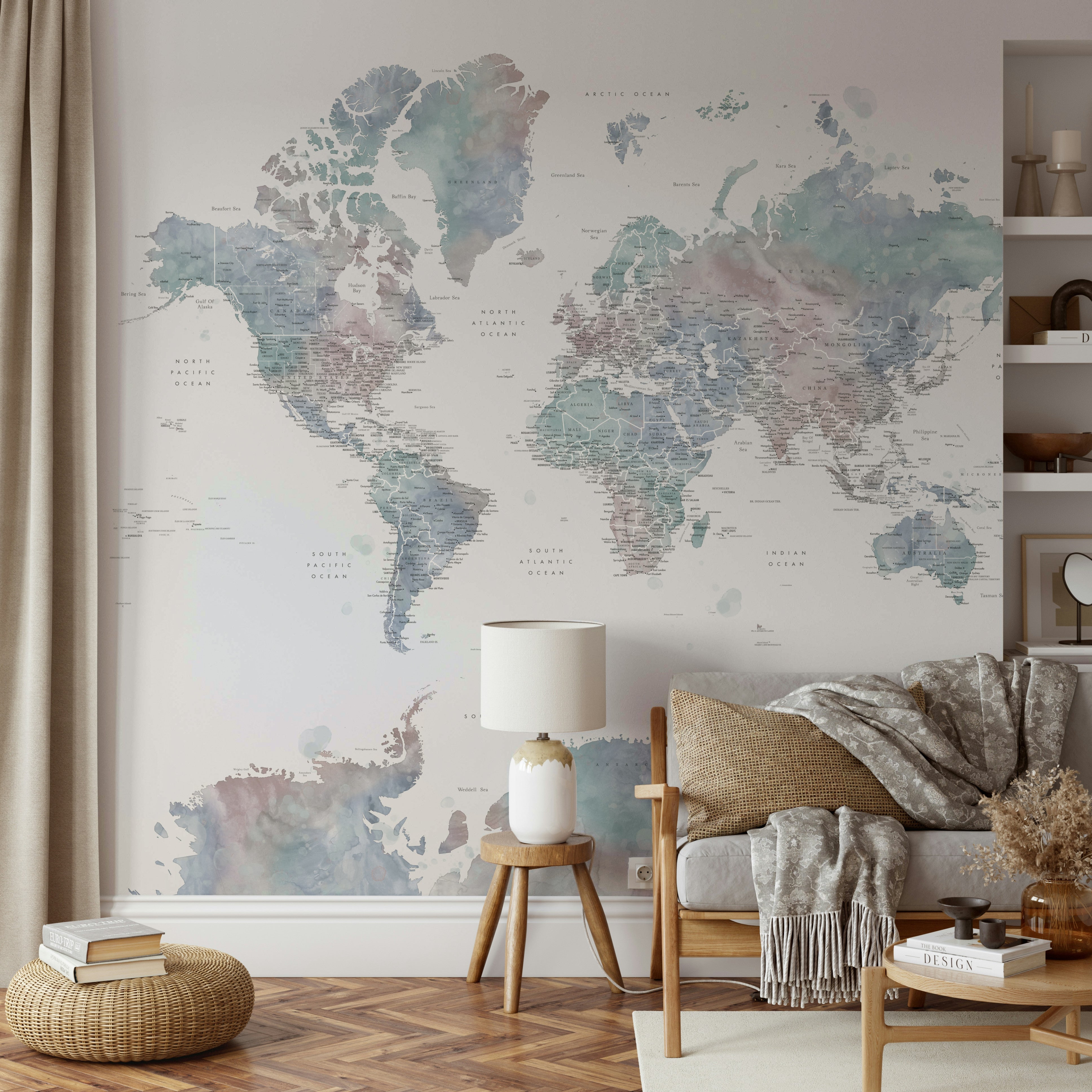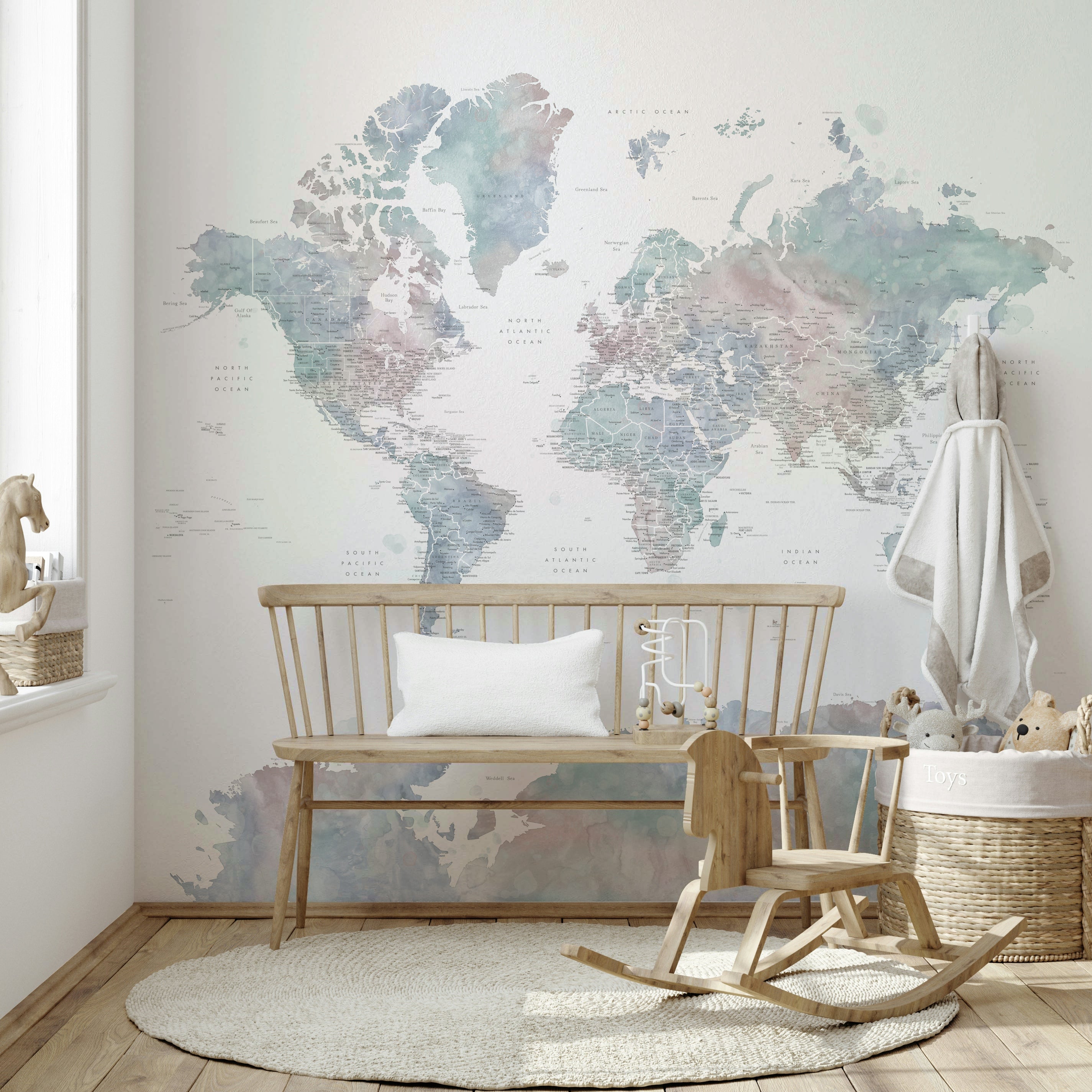 Bring calm sophistication to your space with the Dusty Blue Watercolor World Map Wallpaper. Featuring soft blue-gray tones and delicate watercolor textures, this mural creates a serene and stylish atmosphere in any room. Each country and city is clearly labeled, making it both a decorative and educational piece. Perfect for bedrooms, home offices, nurseries, or study areas, it complements minimalist, coastal, and modern décor. Available in both peel-and-stick and traditional wallpaper options, it’s easy to install and crafted with eco-friendly materials. Add a touch of tranquil exploration to your walls with this beautifully muted world map design.
