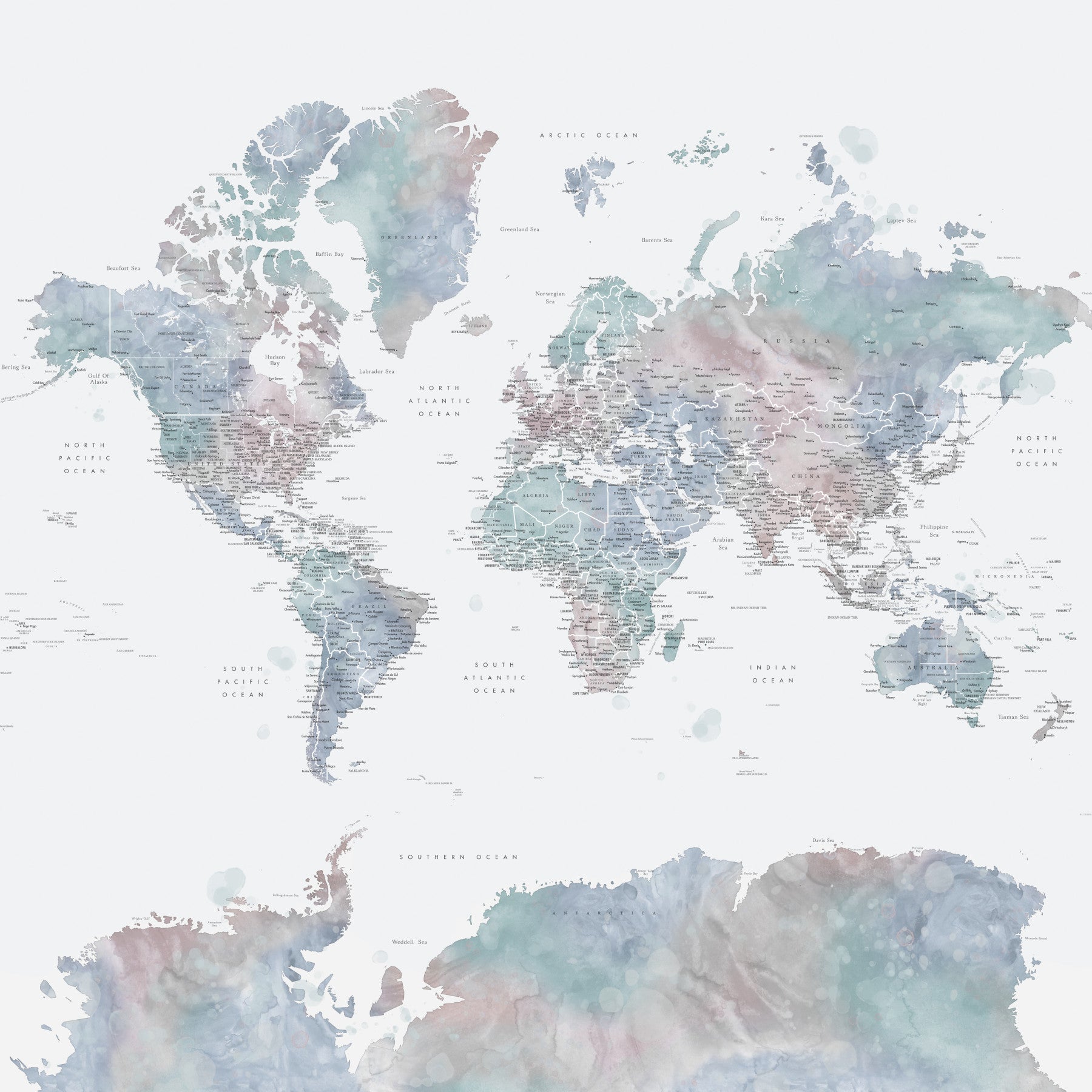Elegant world map in muted blue watercolor tones