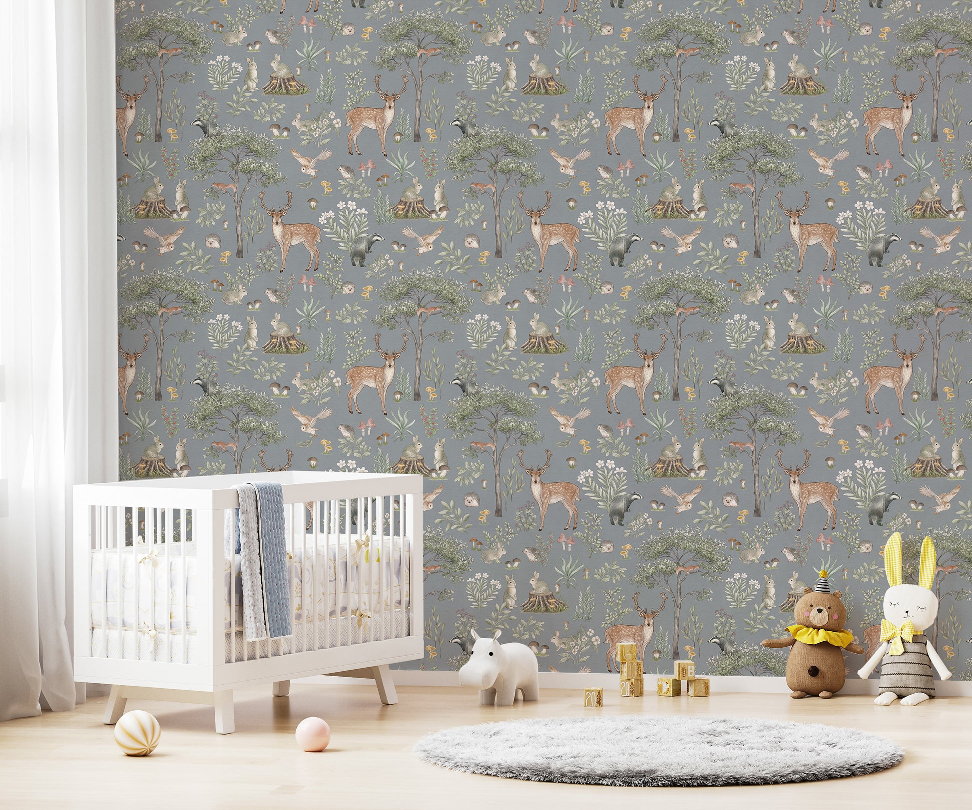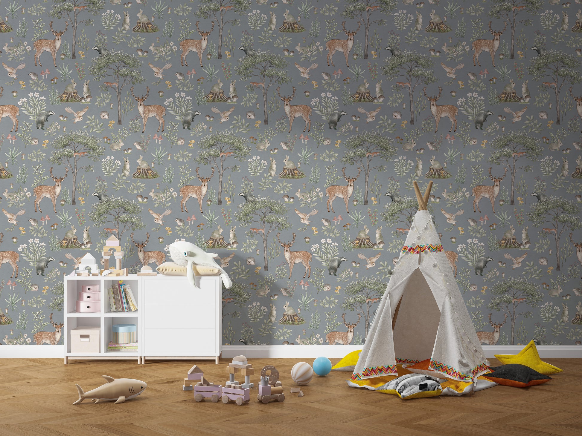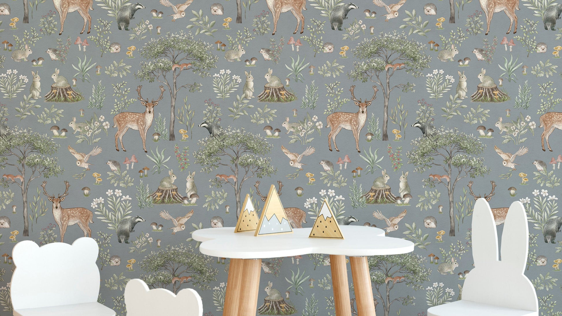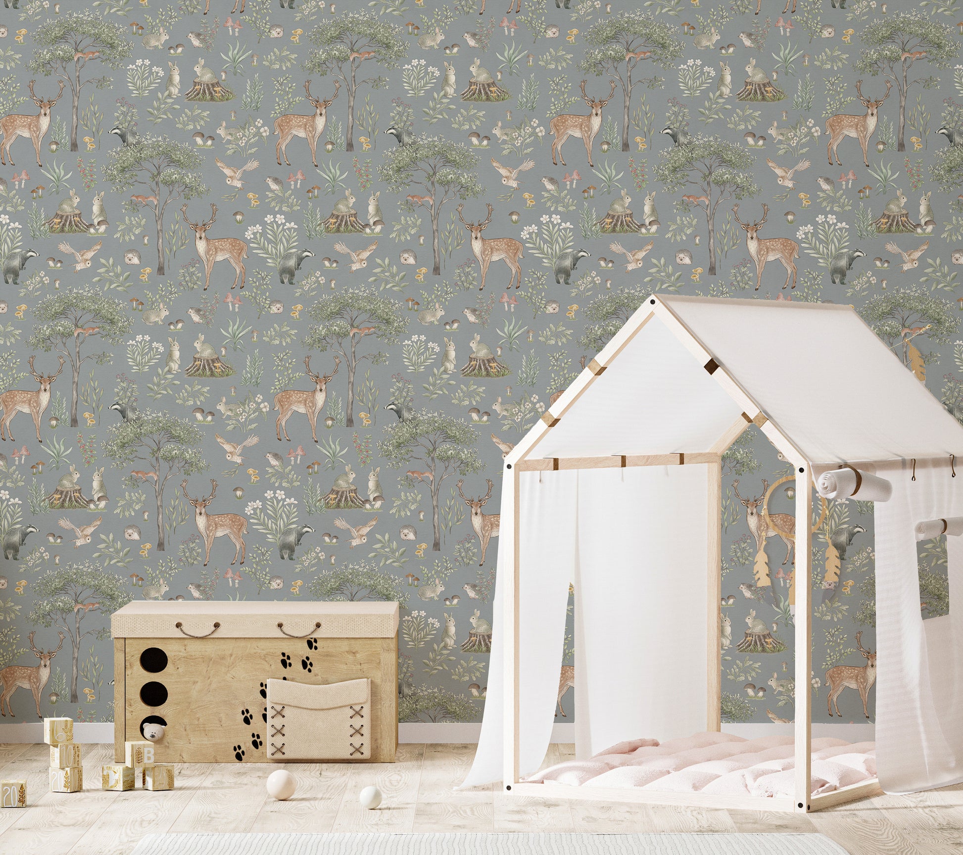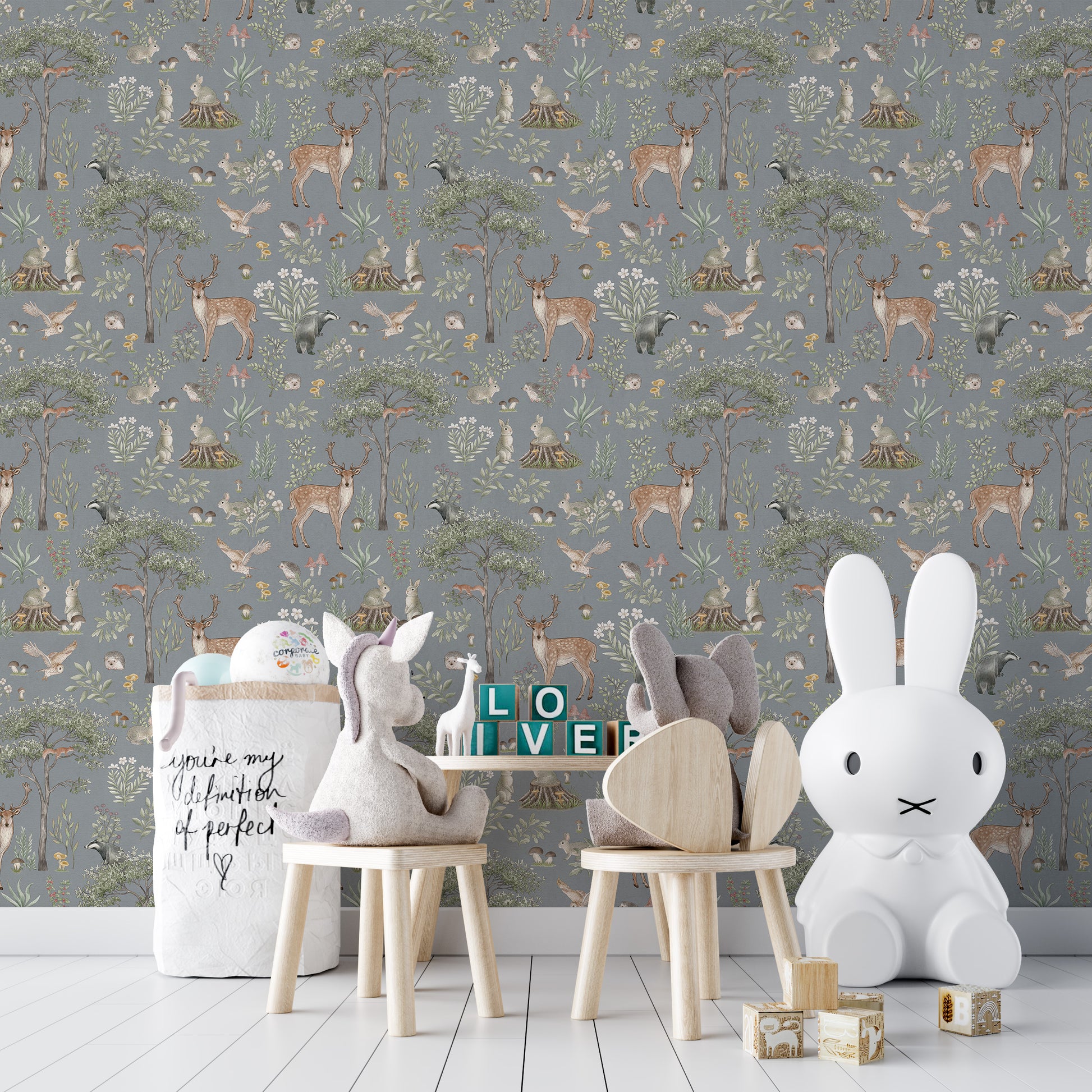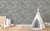 Invite the charm of nature indoors with this dusty blue wildlife wallpaper. Featuring graceful deer, delicate woodland creatures, and flourishing greenery, this design brings a storybook forest to life. The cool dusty blue backdrop creates a calming atmosphere, making it an ideal choice for nurseries, bedrooms, or cozy reading corners. The hand-painted details add warmth, while the deer wallpaper theme introduces a timeless, rustic touch. Whether paired with wooden textures or soft furnishings, this wallpaper blends seamlessly with various decor styles, offering a peaceful retreat inspired by the great outdoors.