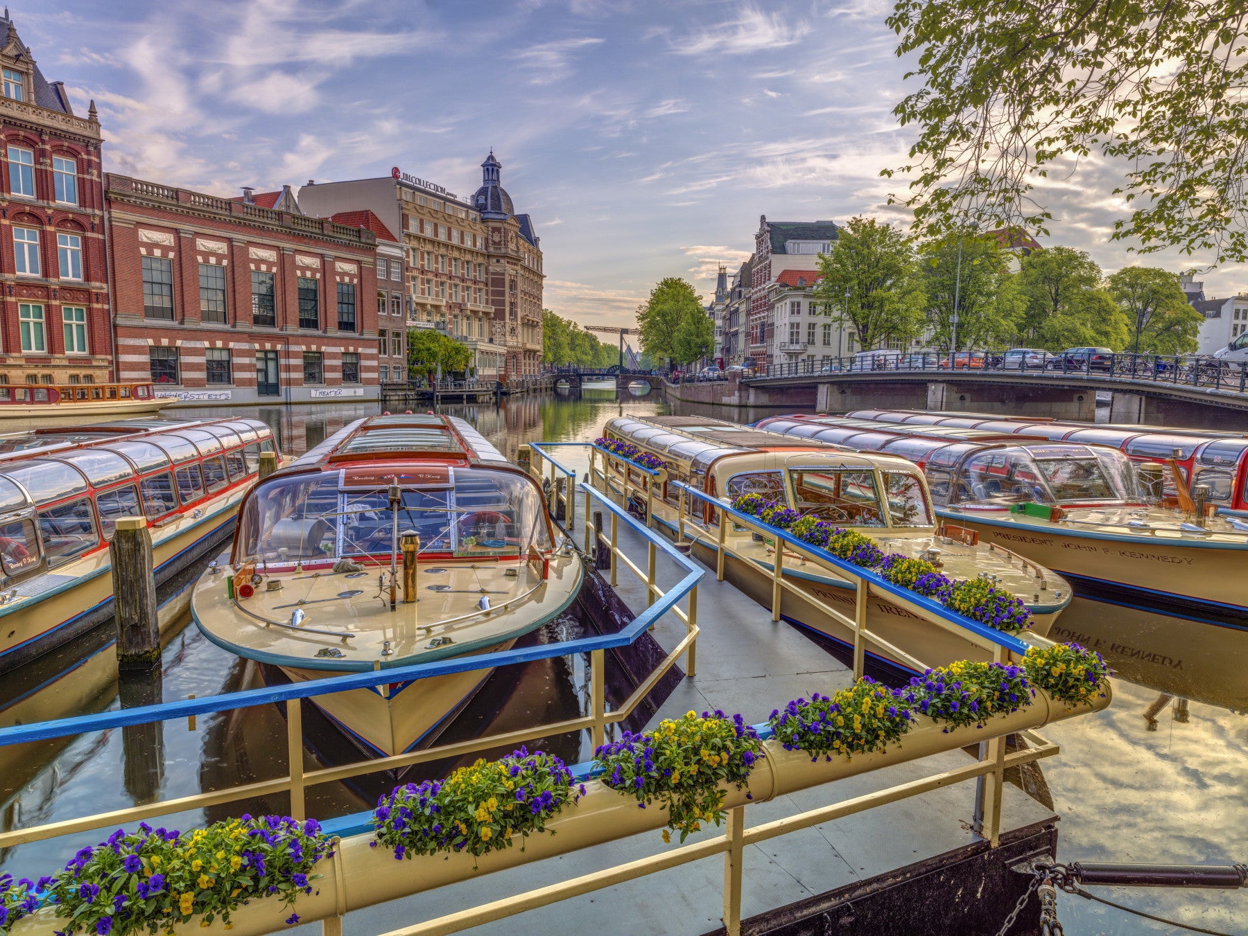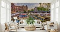 Boats moored in the Canal through Amsterdam city. Invite the allure of Amsterdam into your home with this striking wallpaper for walls, capturing the city’s famous waterways. This mural presents an array of tour boats resting on calm waters, framed by historic architecture and lush greenery. Its serene composition makes it ideal for spaces intended for relaxation. The gentle blend of beige, blue, green, and brick-red tones enlivens walls, creating an inviting atmosphere in any room. Imagine this wallpaper transforming your space into a serene haven, perfectly suited for creating a tranquil retreat in your study or living room.