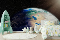 Explore the beauty of our planet with this stunning feature wall. The image captures Earth from space, showcasing continents, oceans, and the night lights of cities against a backdrop of twinkling stars. The feature wall features a blend of deep blues, greens, browns, and whites, creating a dramatic effect. It is ideal for a living room, bedroom, or office, offering a sense of wonder and global perspective. This design complements modern interiors, adding depth and visual interest to any space.