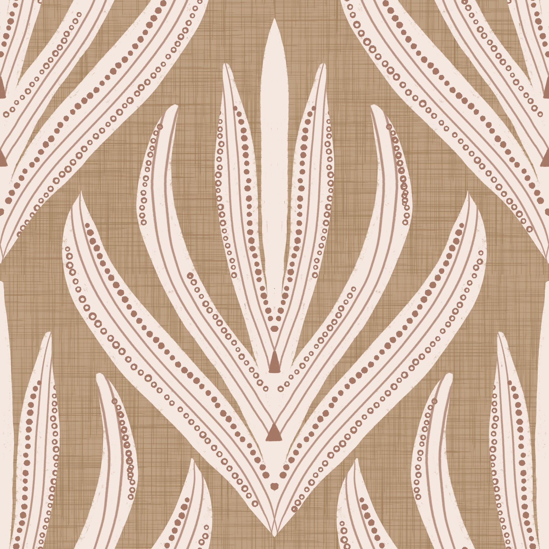 Warm-toned wallpaper displaying cream abstract motifs on a textured tan backdrop.