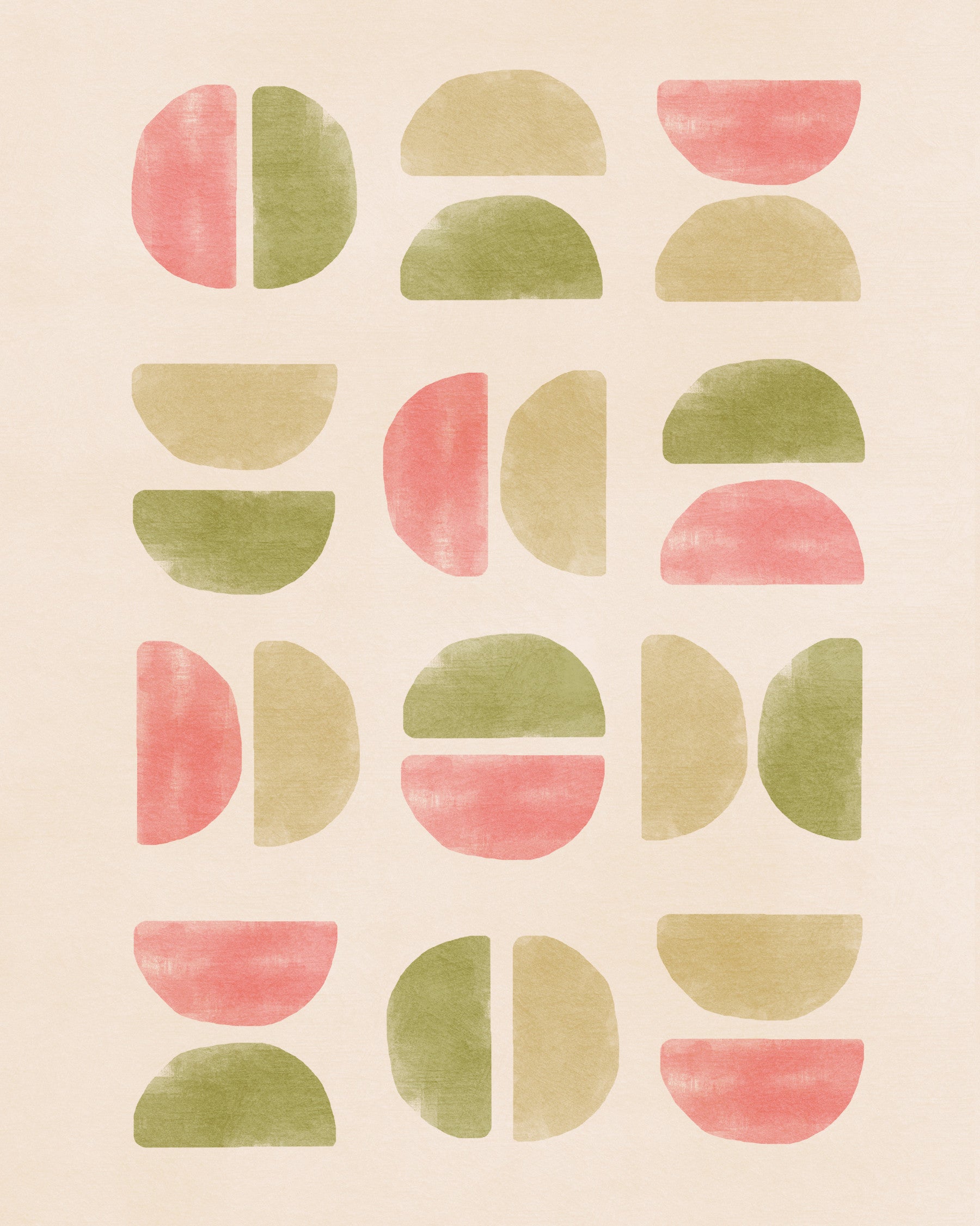 This wallpaper boasts a visually appealing arrangement of softly blended circles and semi-circles in earthy hues. The interplay of blush pink, olive green, and beige creates a sense of balanced harmony and understated elegance. The muted tones promote a tranquil atmosphere, making it ideal for bedrooms, living rooms, or any space seeking a calm and sophisticated feel. The slightly textured, watercolor effect imparts a hand-painted quality, adding a touch of warmth and character to your walls. This is the perfect choice for those who appreciate minimalist designs with a touch of natural warmth.