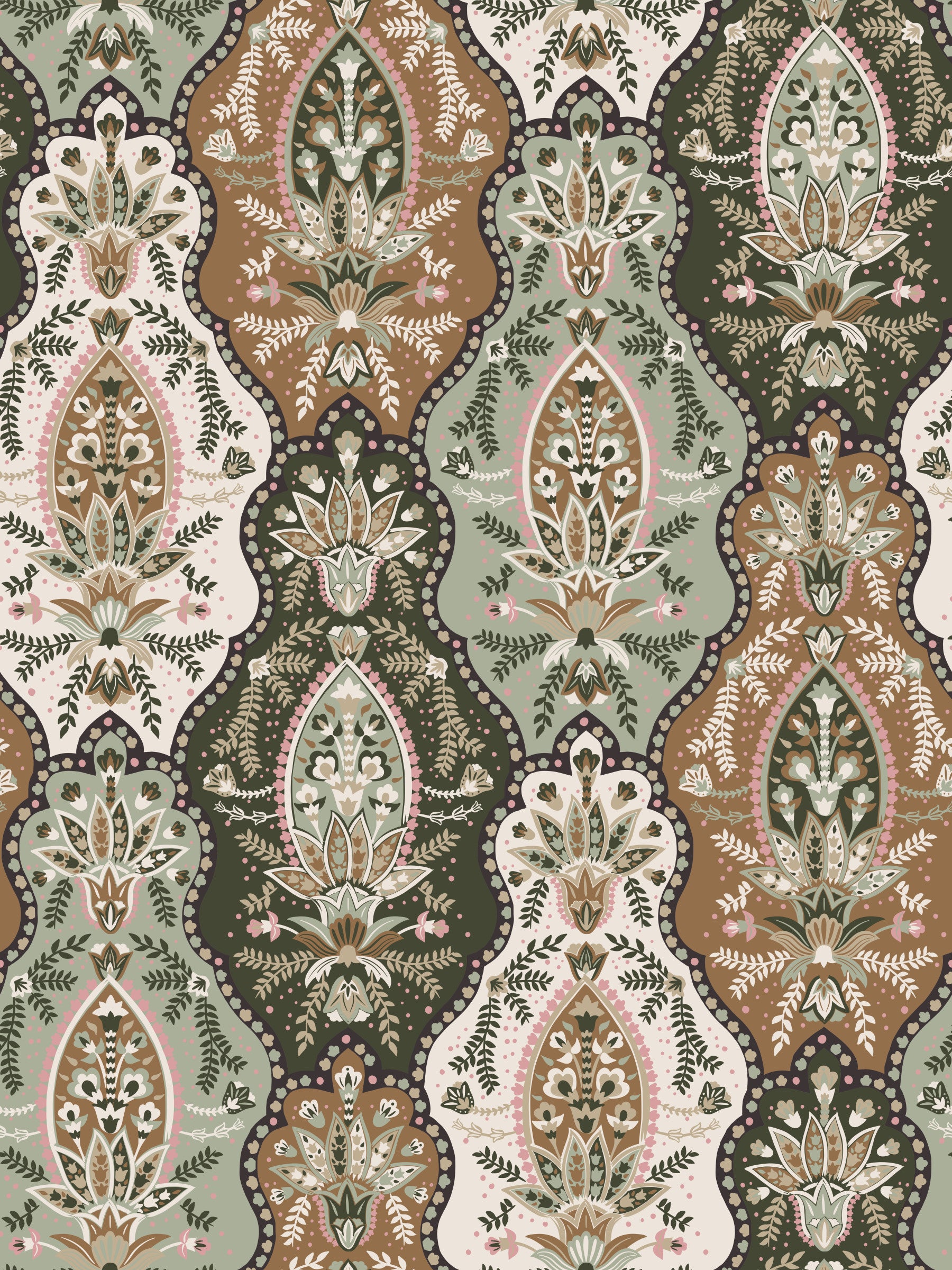 Traditional floral wallpaper mural with repeating earthy motifs in warm and cool tones.