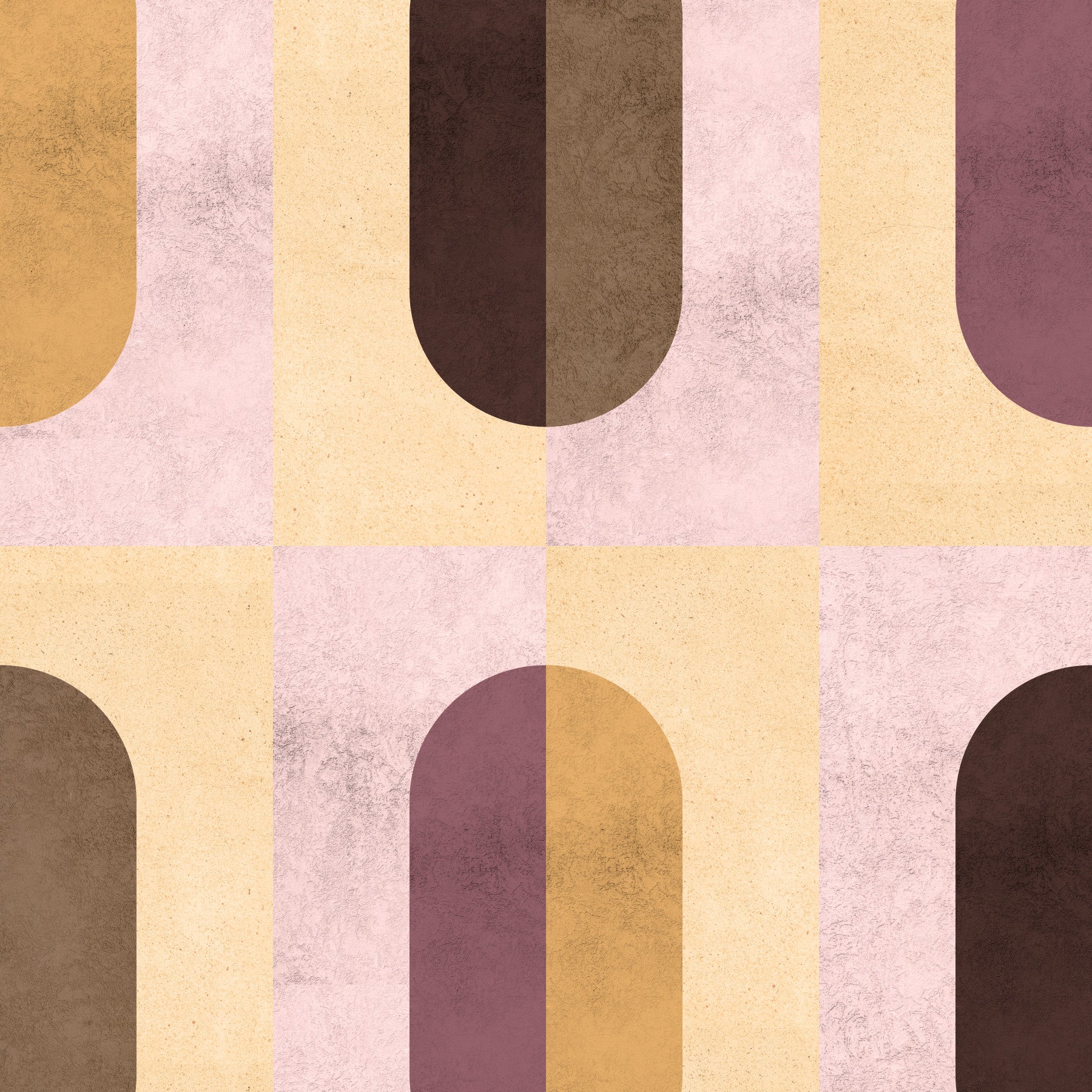 A modern and minimalist wallpaper featuring a geometric pattern in warm, earthy tones. The design utilizes a repeating motif of rounded rectangles in shades of beige, brown, mauve, and a delicate pink, creating a balanced and visually appealing composition. The subtle textural variation within each color adds depth, while the overall palette evokes a feeling of calm and natural serenity. This design is perfect for those seeking a sophisticated yet understated look in any room of their home.