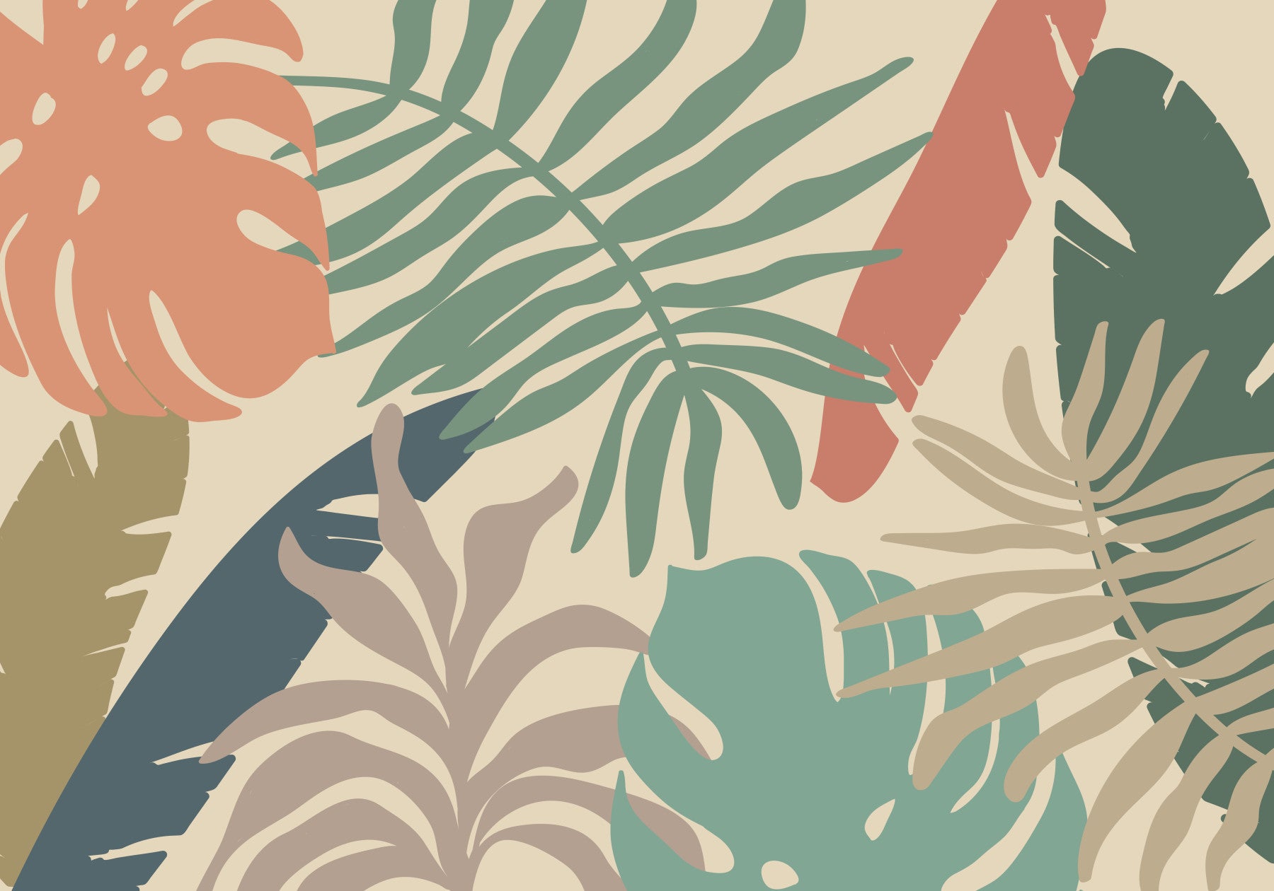 Invite nature into your home with this earthy jungle design. The composition presents abstract leaves in colors of green, beige, terracotta, and blue. This wallpaper for walls creates a natural atmosphere. Picture it in a living room or bedroom, where its soft palette makes a peaceful setting. Its unique composition adds a touch of visual interest and a gentle calm to your decor. Embrace the soothing shades and earthy tones.