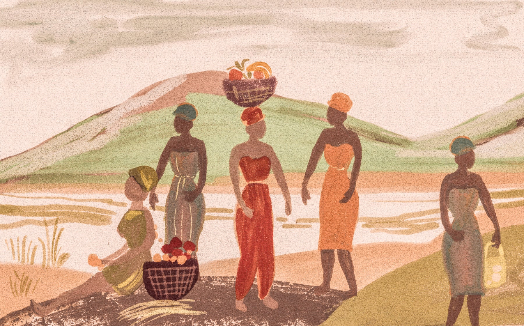African-inspired wallpaper with women in traditional dress holding fruits and grains.