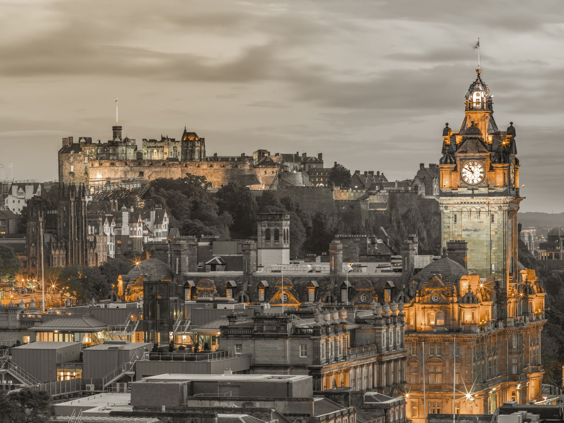 Sepia tone Edinburgh Twilight castle photograph, majestic urban backdrop.