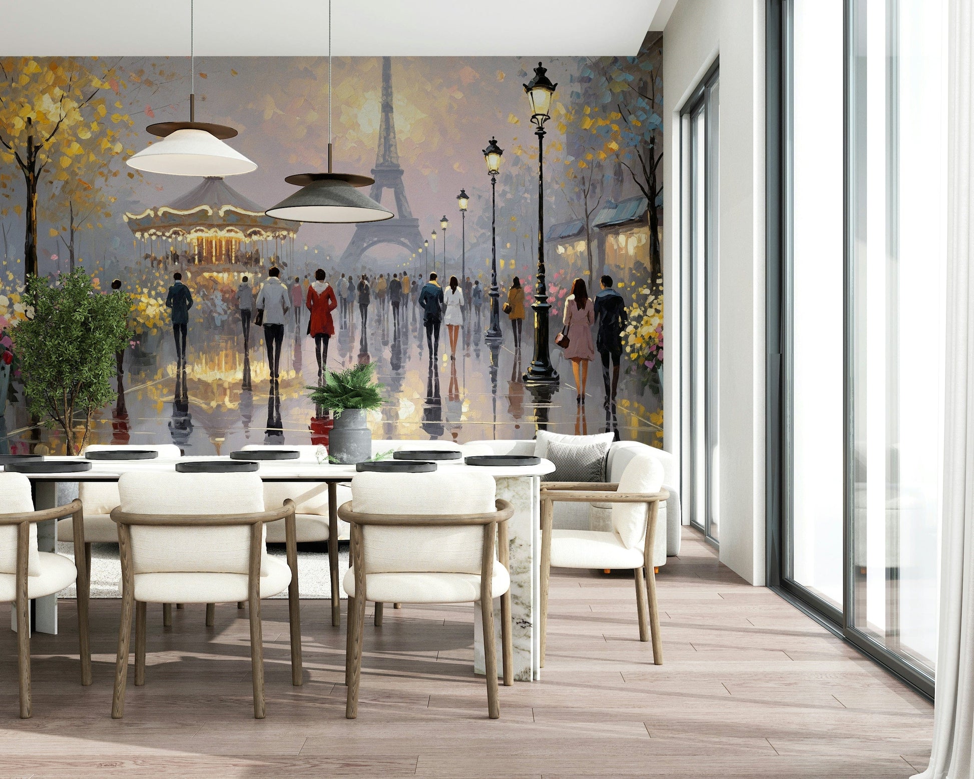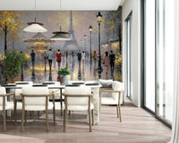 Infuse your home with the allure of Paris using this dreamlike scene. Soft pastel tones and gentle brushstrokes bring the city's iconic landmarks to life. A carousel and the Eiffel Tower offer a captivating backdrop for figures strolling on a rainy day. This wallpaper for walls creates a sophisticated and inviting ambience in any interior. Use it in a living room, bedroom, or office for a touch of French elegance. The reflective surfaces add depth, while the subdued colour palette complements a range of décor styles, from classic to modern.